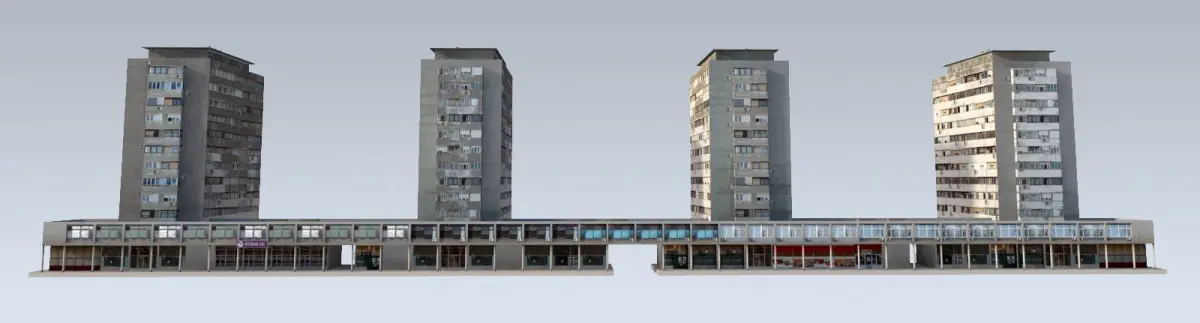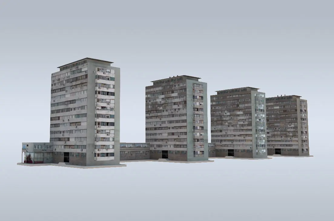 Although quite old and run-down, these residential towers in the frequent Belgrade boulevard make a dominant figure in the neighborhood. Low geometry and photo textures make them ideal for realistic urban/cityscape scenarios, especially for modest neighborhoods, slums, Eastern European scenarios.