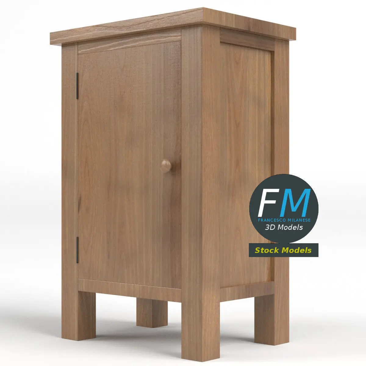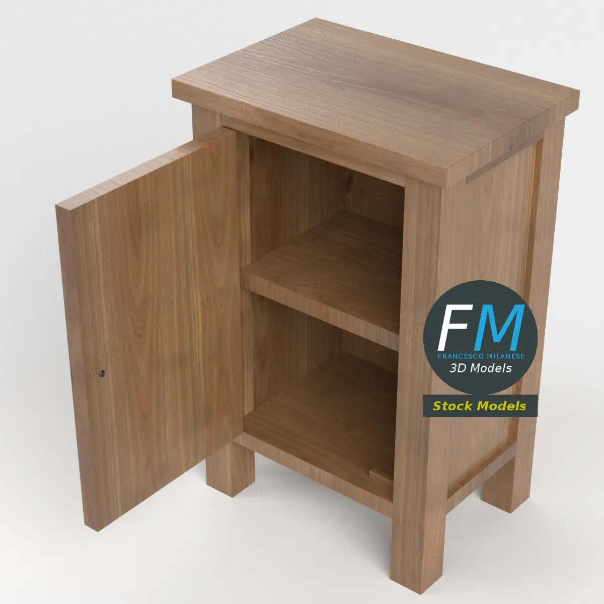 Small 1 door cabinet 3D Model. 3 individual objects (frame, shelf, door), sharing the same non overlapping UV Layout map, Material and PBR Textures set. Production-ready 3D Model, with PBR materials, textures, non overlapping UV Layout map provided in the package.Quads only geometries (no tris/ngons).Easily customizable: UV unwrapped geometries; UV Layout maps provided in the package as png with alpha images.Each Object, Material or Texture provided in the package has a unique, meaningful name.Made in Blender 3.3 with Cycles Principled BSDF PBR shader with textures included (Eevee compatible), then exported to OBJ and FBX; materials and textures made in Substance Painter (Adobe 3D Painter), exported for PBR, Cycles, V-Ray, Unity, Unreal.PROMO IMAGES: the first image has been rendered in Cycles for Blender; in particular, you can find 11+ promo images in this description: