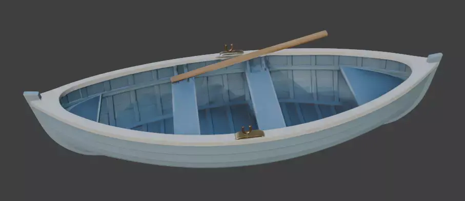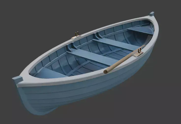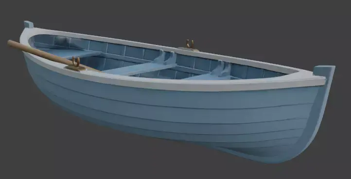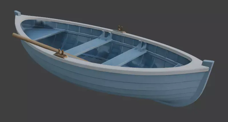 A charming, pristine 3D model of a traditional wooden rowboat featuring soft sky-blue painted hull with crisp white trim, natural wood thwarts, oarlocks, and a single oar. Simple, clean topology and PBR materials make it perfect for calm lake scenes, children’s renders, coastal environments, games, animations, or any peaceful water setting requiring a timeless small boat.