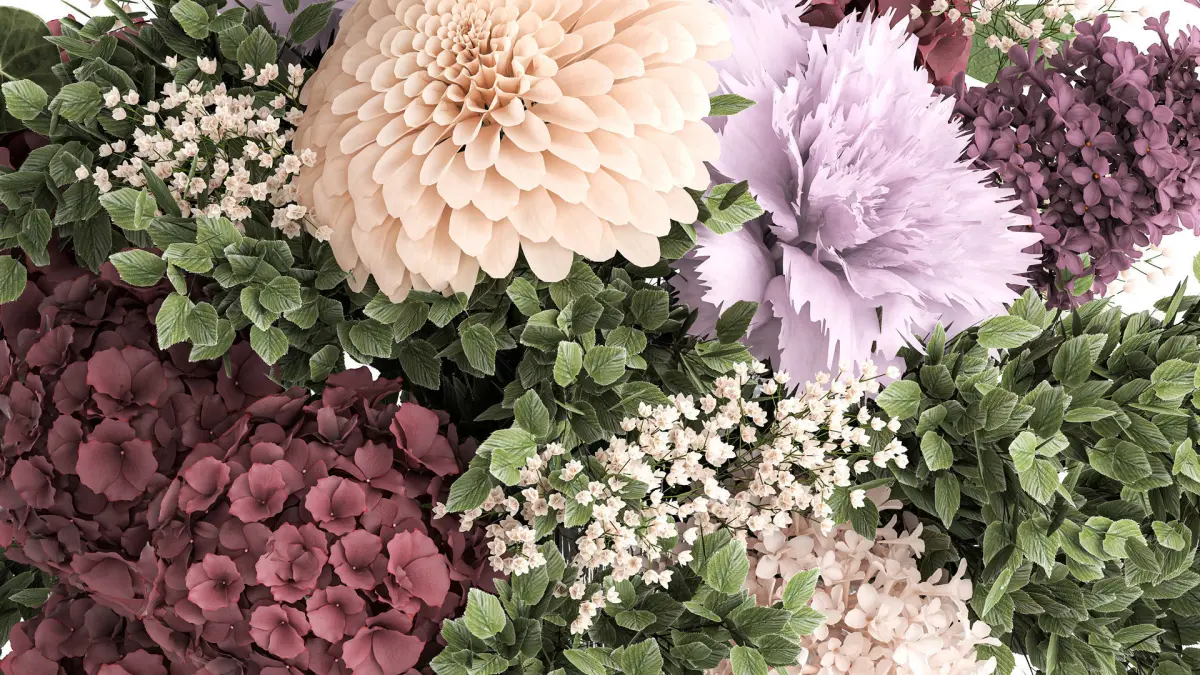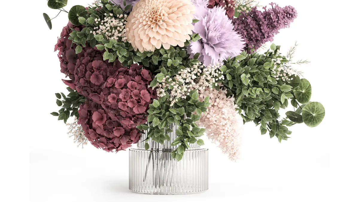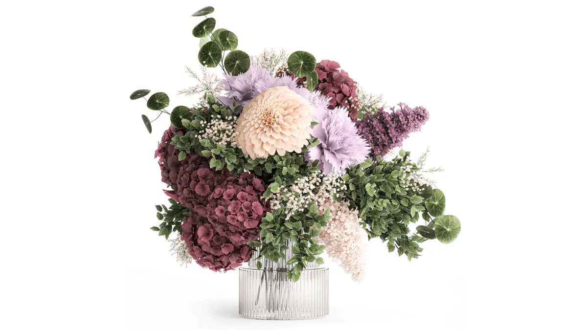 Small bouquet of flowers hydrangea lilac dahlia vase