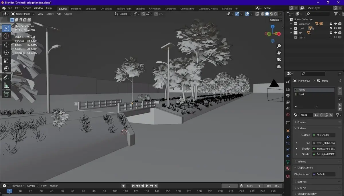 This is a small bridge model in country side area. This made in Blender 3.2.2. Trees are located far from roads are usually made in plain using transparent texture.There are no other version avialable except blend.I use nishita sky texture for render in cycles.Hope you like this model.