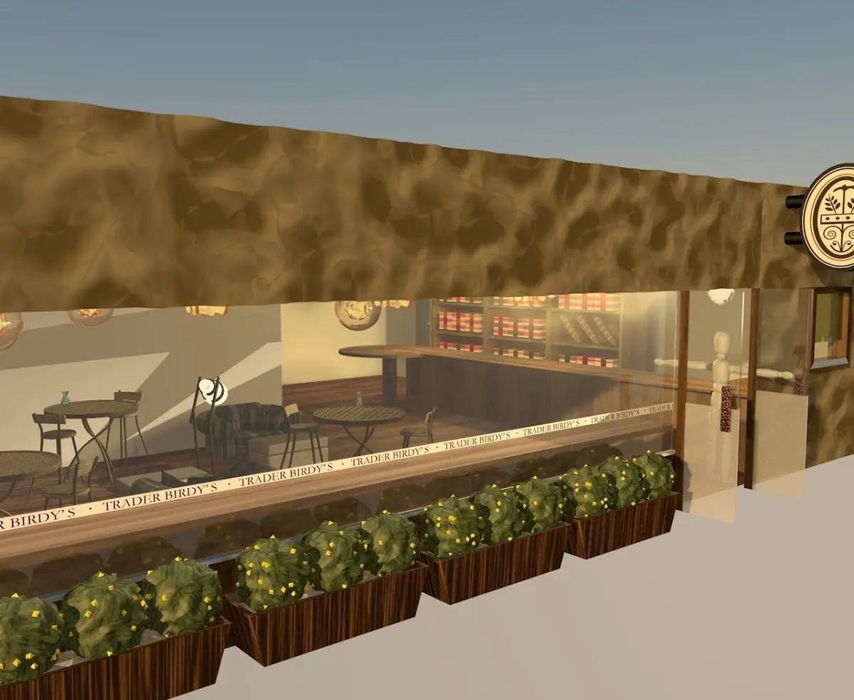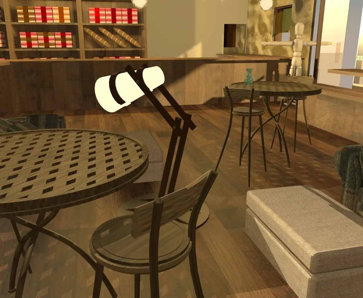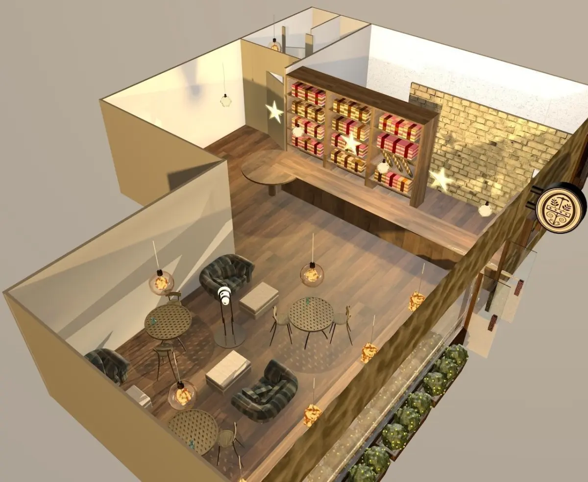 This bakery/cafe model gives a warm wood feeling and detailed design.
