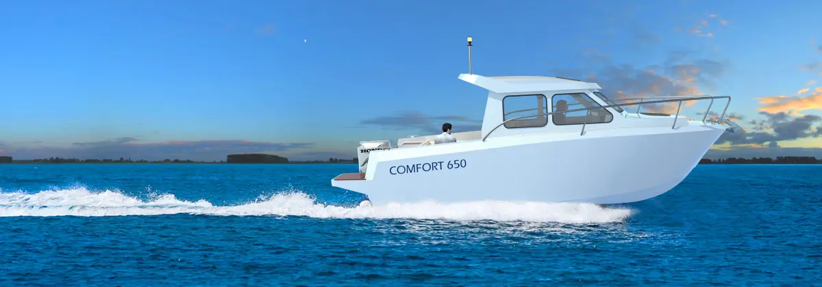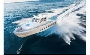 This is a sleek, high-performance speedboat designed for speed and agility on the water. The boat features a streamlined hull with a sharp, pointed bow for cutting through waves efficiently. Its exterior is primarily grey with striking red and black accents along the sides, giving it a sporty and stylish appearance. The cockpit is equipped with two bucket seats for the driver and a passenger, and the rear seating area is arranged in a U-shape, providing ample space for additional passengers. The dashboard is compact yet functional, designed for easy access to controls and instruments. The boat's design emphasizes both performance and comfort, making it ideal for thrilling rides and recreational outings on the water.