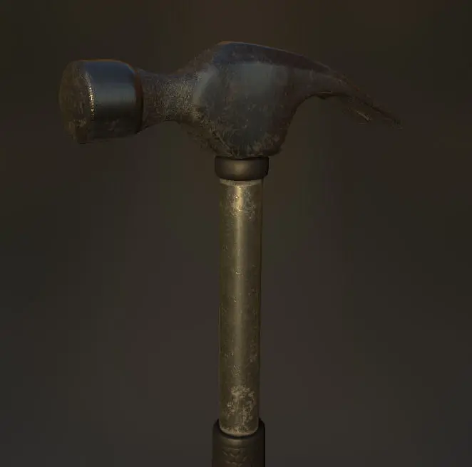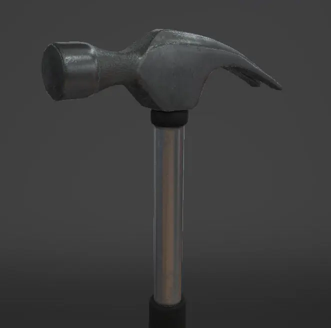 This 3D model features a claw hammer with a polished metal head, showcasing a flat striking surface on one side and a curved claw for nail removal on the other. The handle is designed with a textured rubber grip for comfort and slip resistance, making it both functional and ergonomic. The model’s realistic textures and detailed design make it ideal for use in product visualizations, educational tools, or digital environments where a high level of detail is required.