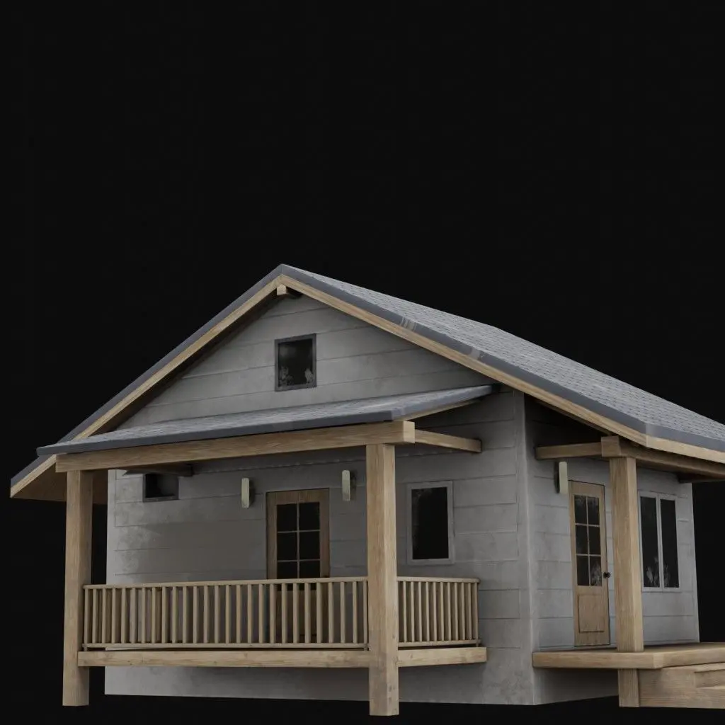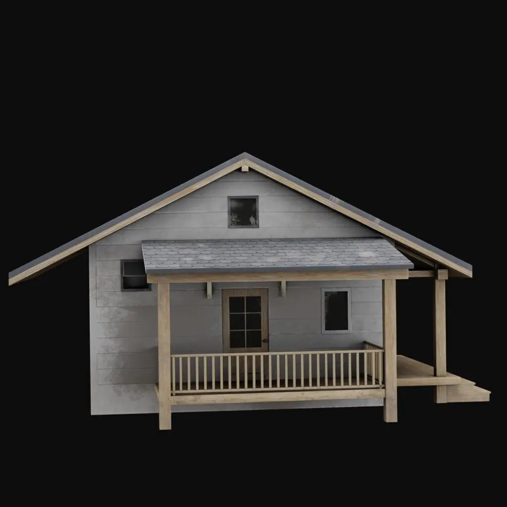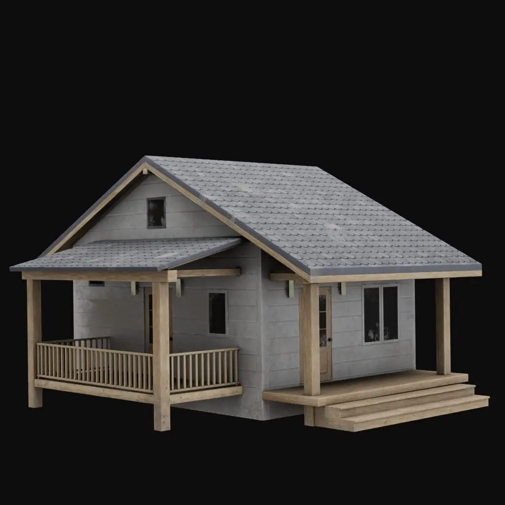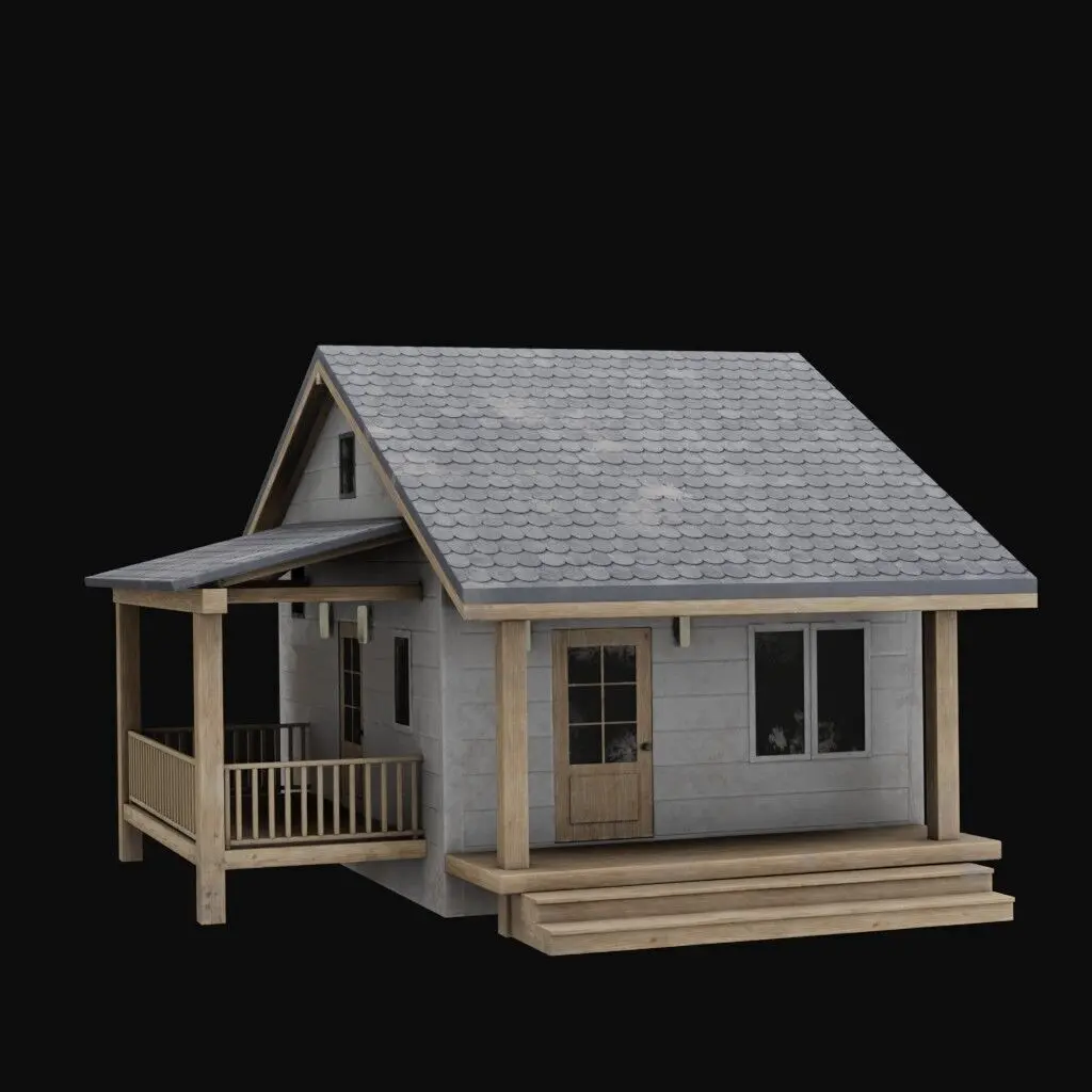 Cottage is a rustic wooden house model with a cozy front porch and textured shingle roof.