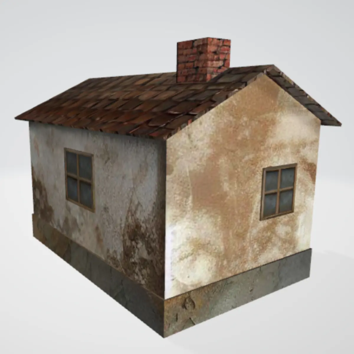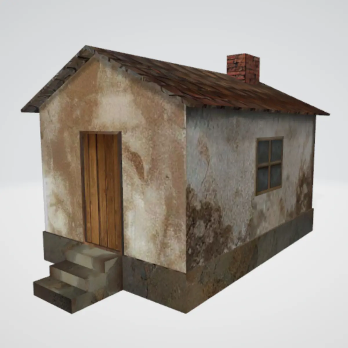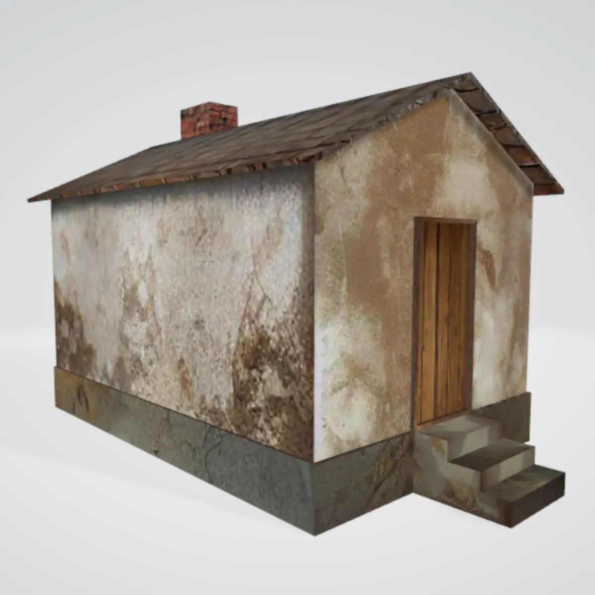 Old small house low-poly 3D model with textures and materials. For games, videos, mods, animations, etc. Plastered building with tile roof and brick chimney and stone or concrete stairs or steps to a wooden door. Enjoy!