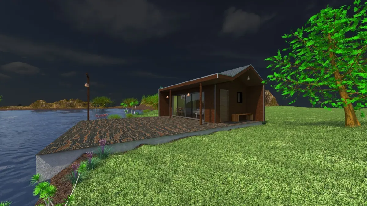 The design represents a small wooden hut equipped with all furniture + a small kitchen and a small bathroom