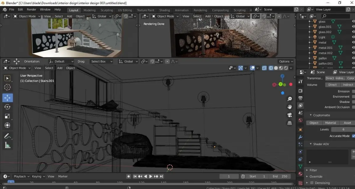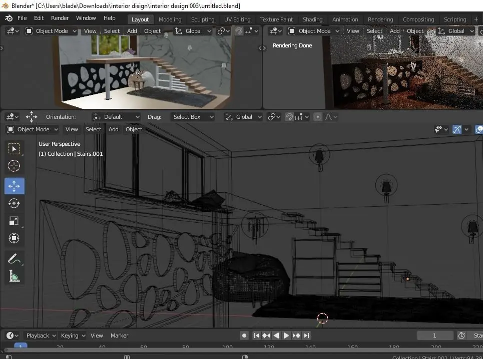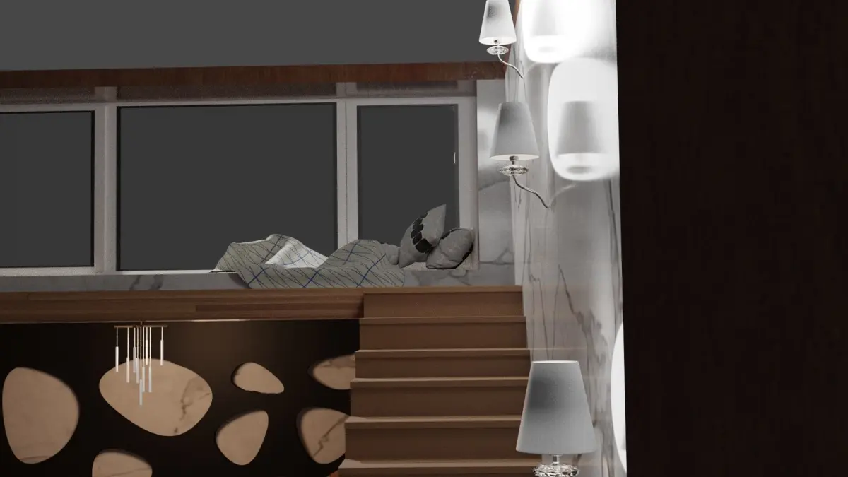 This small render comes with a, bean bag chair, 4 pillows, 2blankets, small desk, phone, 2 shelves, stairs extruded window, hanging lights, 3wall lights, second floor, a carpet, and last a decoritive wall. with a darkened wood floor, and marble walls with dark wood accents, the stairs and second floor are a lighter wood. all made in blender.