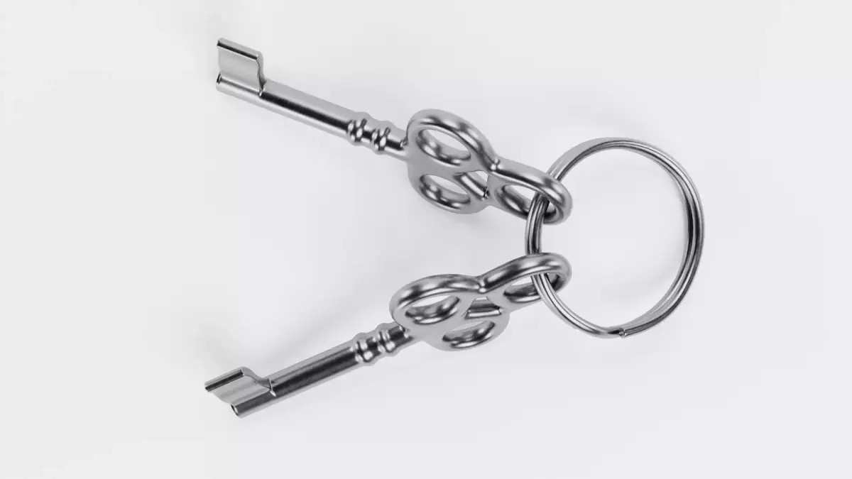 A pair of matching hollow barrel skeleton keys featuring an elegant trefoil-style handle design, securely organized on a classic metal ring. This single asset combines historical charm with a pristine, polished finish, showcasing subtle surface details that maintain a realistic look in close-up renders. It serves as a perfect functional detail for high-end furniture, decorative chests, or period-accurate interior scenes.