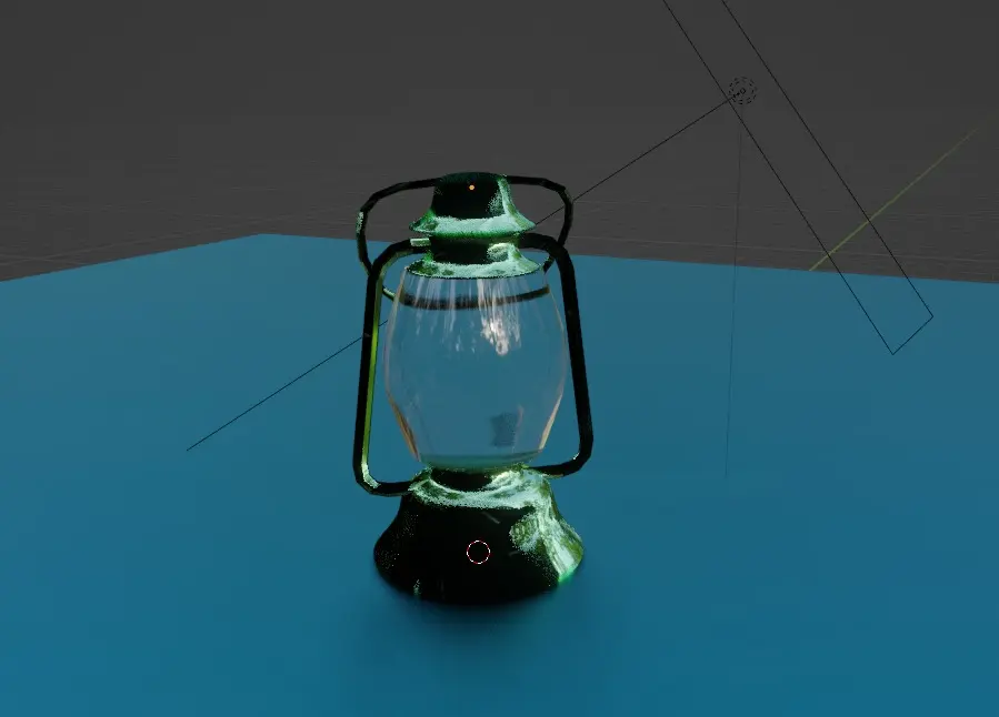 This a small classic lantern with a glowing light inside. The lantern appears to be made of a reflective metal and is placed on a smooth surface with a blue hue. The light within the lantern emits a warm glow, creating a beautiful contrast with the cooler tones of the surrounding environment. This play on lighting and reflection gives the image a calm and serene atmosphere.