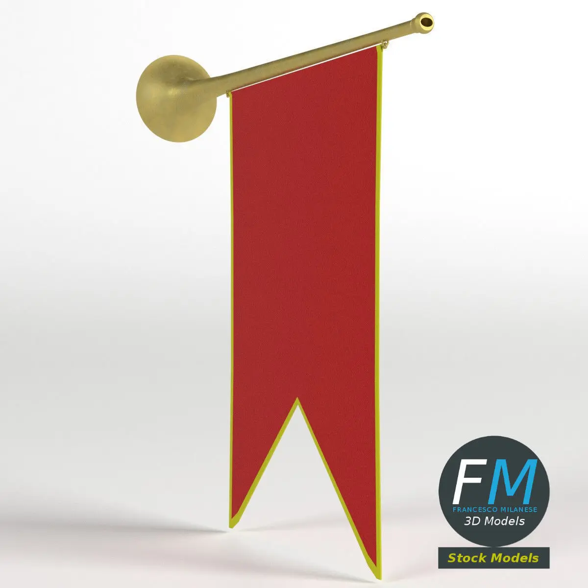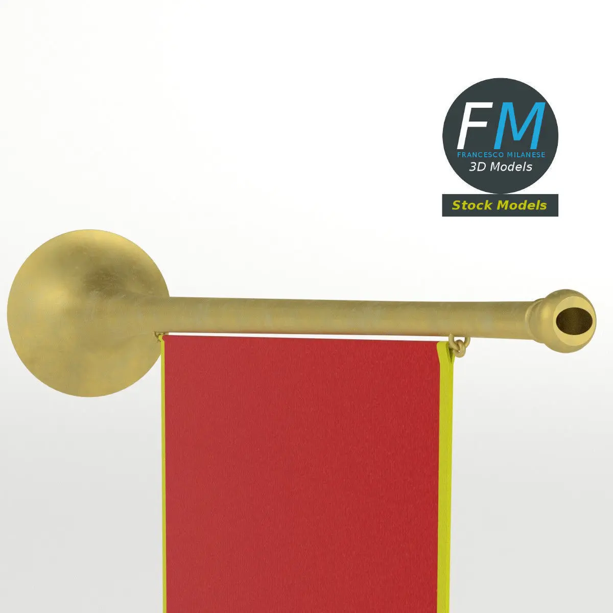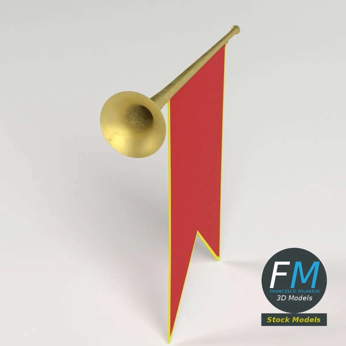 Small medieval trumpet fanfare with banner flag 3D Model. 2 individual objects (trumpet, banner) sharing the same non overlapping UV Layout map, Material and PBR Textures set. Production-ready 3D Model, with PBR materials, textures, non overlapping UV Layout map provided in the package.