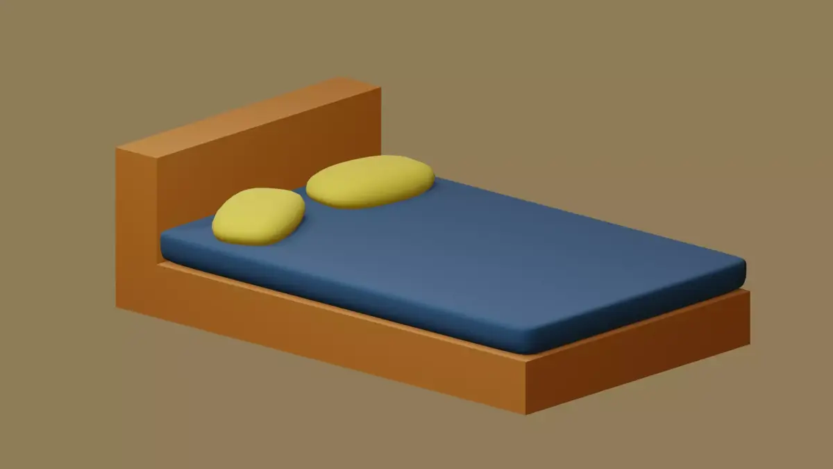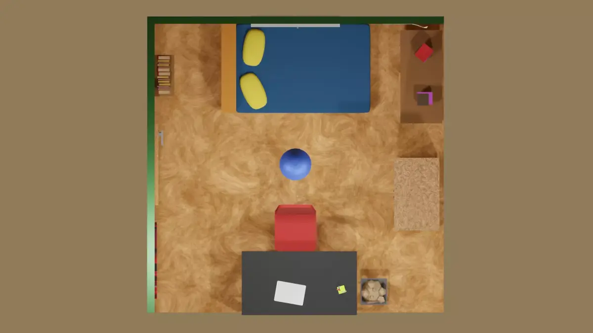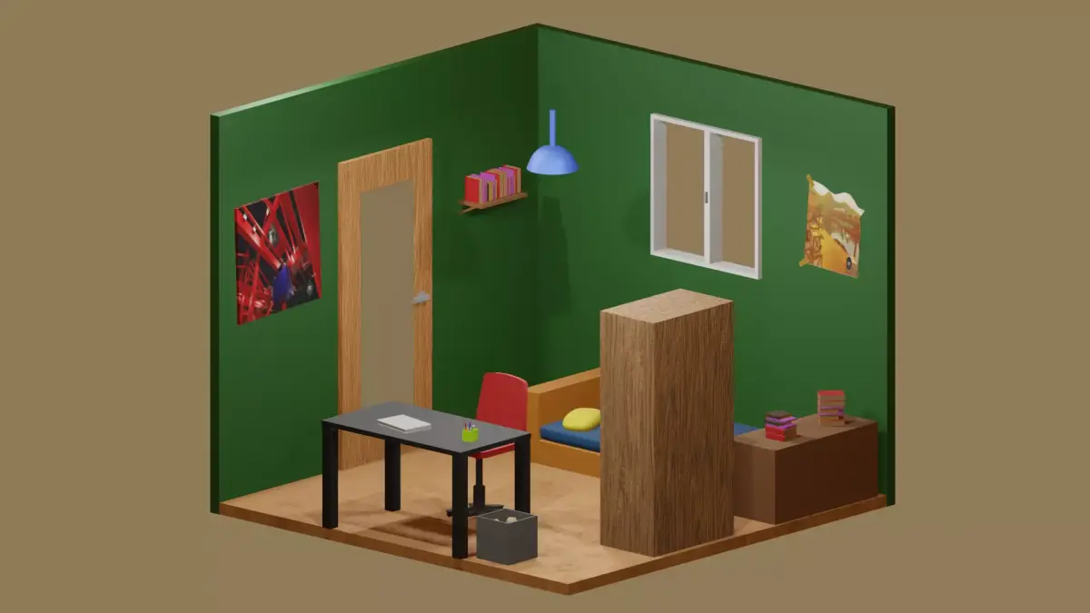 A small miniature bedroom with a bed, a desk and a wardrobe. Next to the bed there is a view from the window, and on the walls there are a couple of photographs, as well as books on the shelves, next to the desk there is a bin and door to the bedroom.