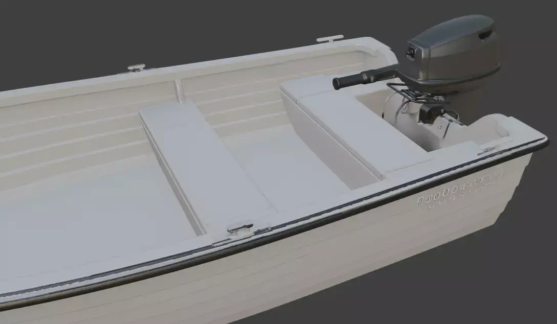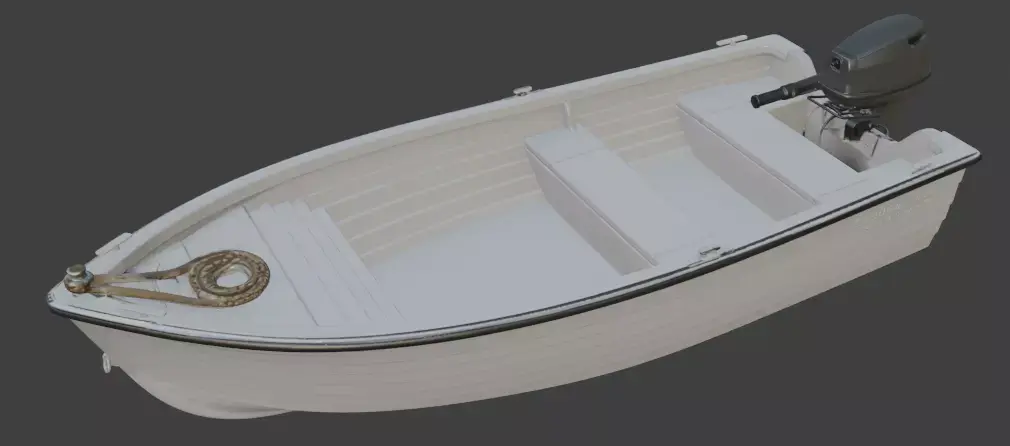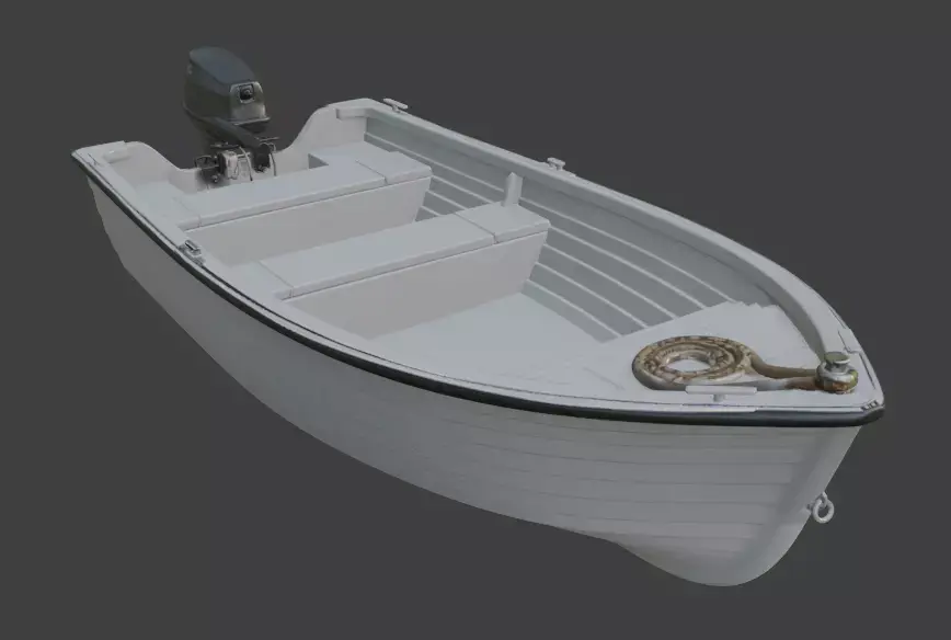 A pristine, lightweight 3D model of a modern aluminum fishing boat with clean white hull, ribbed interior benches, outboard motor mount, coiled rope detail, and simple practical design. Ideal for lakes, rivers, coastal scenes, fishing games, realistic water environments, or any project needing a minimal, durable small motorboat. PBR-ready, low-poly friendly, clean topology and fully UV unwrapped.