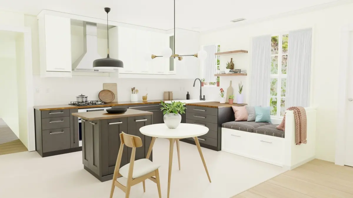 small kitchen atchived whith blender 2.9a small dining room in the area in-between with a few design tricks with a simple dining table and chairs and hang a light fixture above to define the table areaA small cushioned bench provides extra seating and adds a sense of comfort