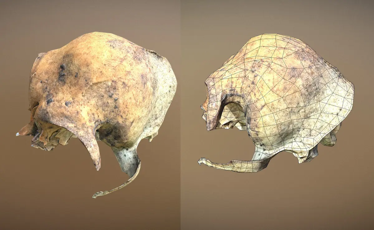 Small rodents skull. Original size around 5.5 cm. Comes with 4k pbr textures. Also automatically reduced poly count for lod1 model that has 398 verts and 640 polys. Nice round shape - will work well for any real time application.
