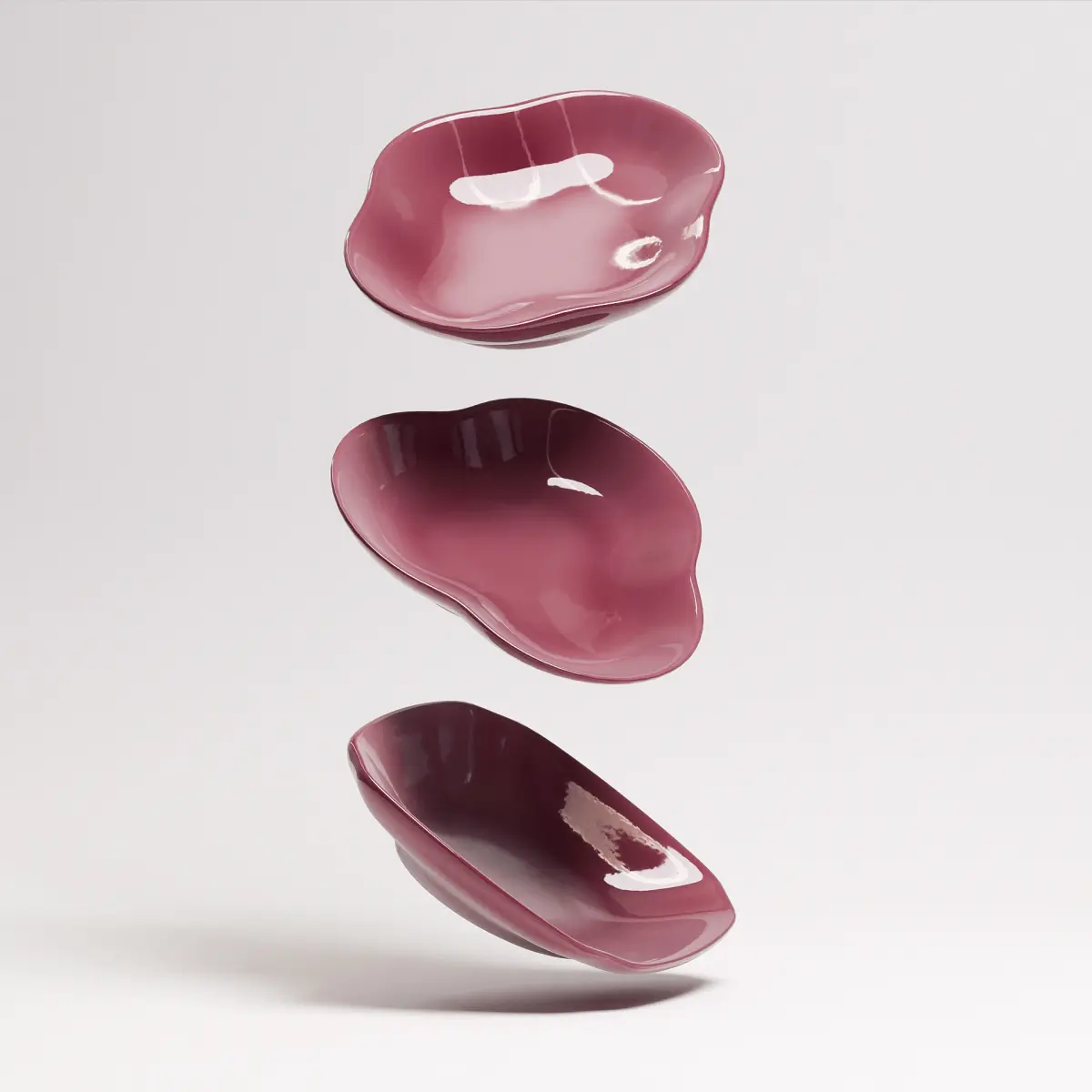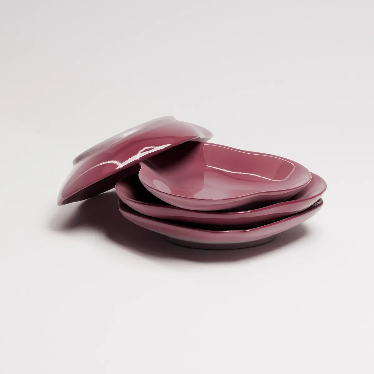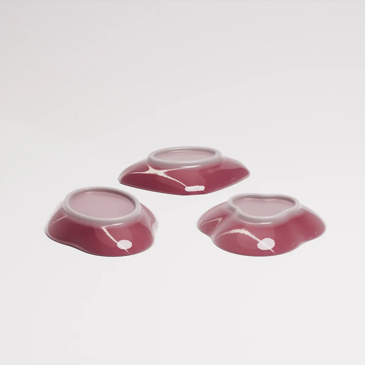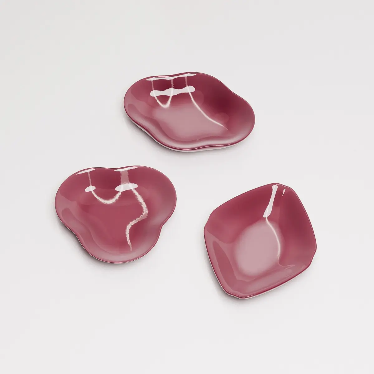 This Japanese-inspired mamezara set features three uniquely shaped porcelain plates, each designed with a vibrant glaze finish to showcase their delicate craftsmanship. These small plates are perfect for side dishes, condiments, or as decorative accents in various settings.
