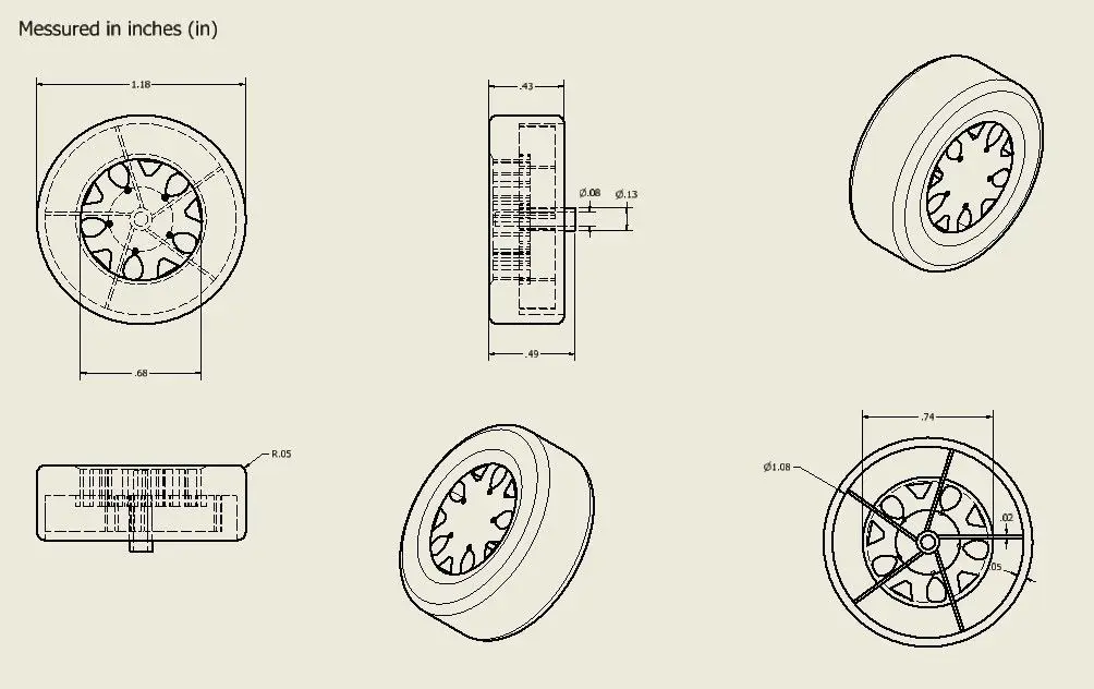 A small wheel that is 1.18 inches in diameter. Can be used on tiny robots or as a replacement wheel for some toys. More specific dimensions are attached to the picture gallery.