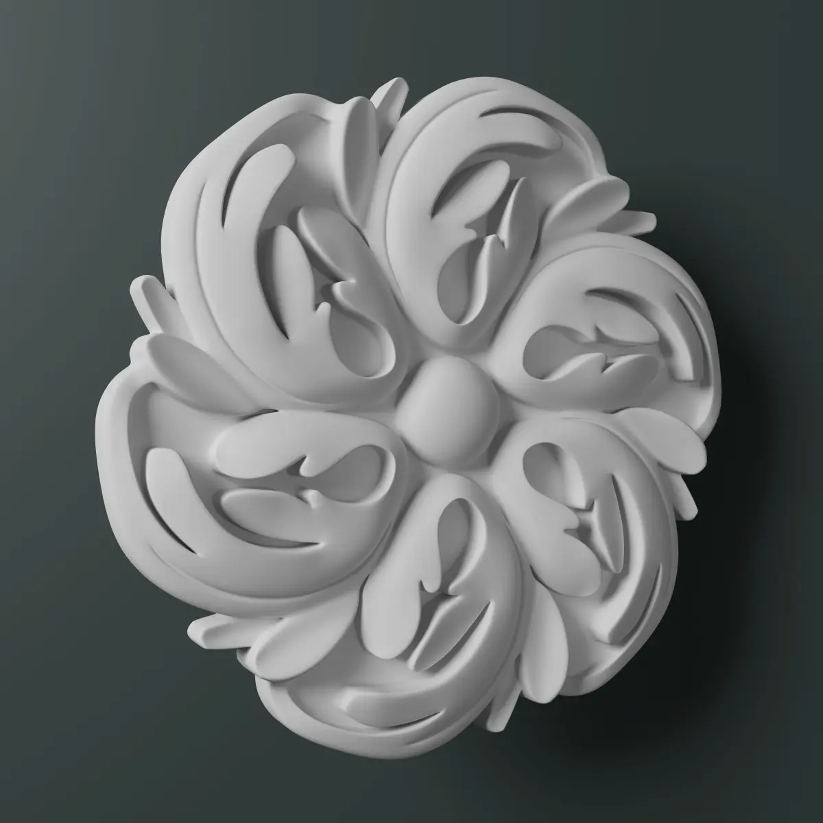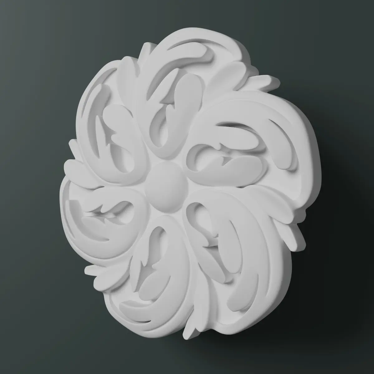 This is a model of a decorative floral rosette. Traditionally rosettes are made from stone, plaster or wood and used for decoration on architectural features for interiors and exteriors.