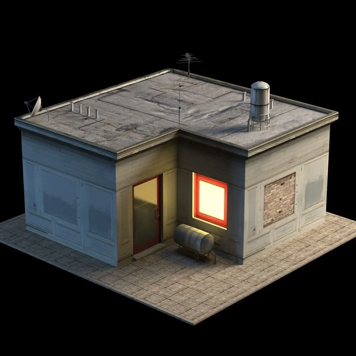 A 3D model of a low poly building. Exterior only, no interior.