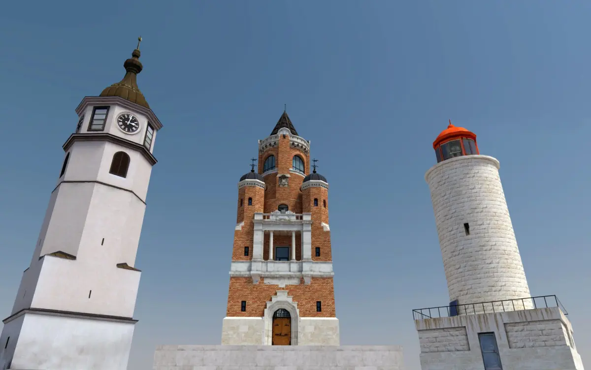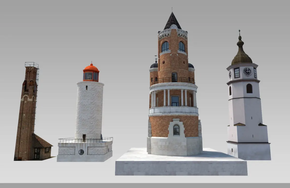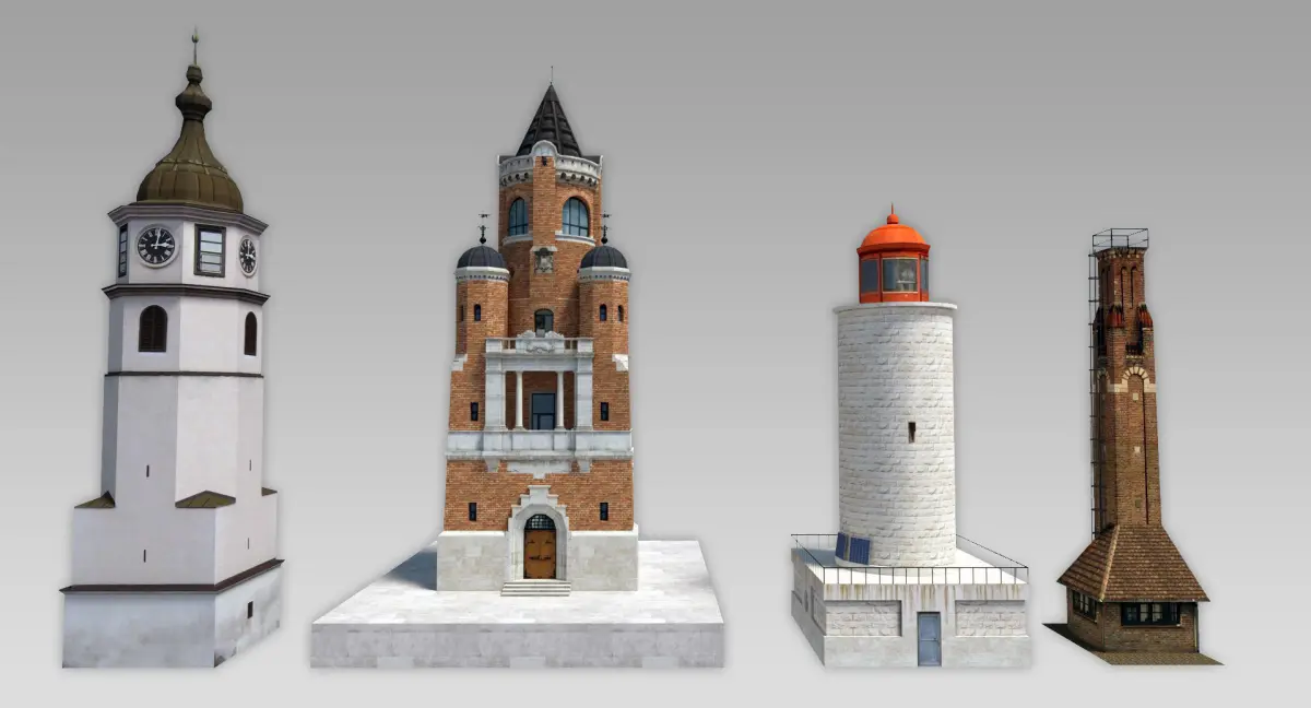 This is a pack of small and stylish towers I have modeled thru time. You have a baroque clock-tower, eclectic-styled monumental tower, white stone lighthouse (from Chateau d’If in Marseille) and as an addition, an industrial style watchtower or fancy chimney if you like. Towers can fit nicely in the historic parts of the city, pedestrian area, hill or other.