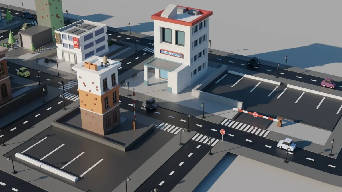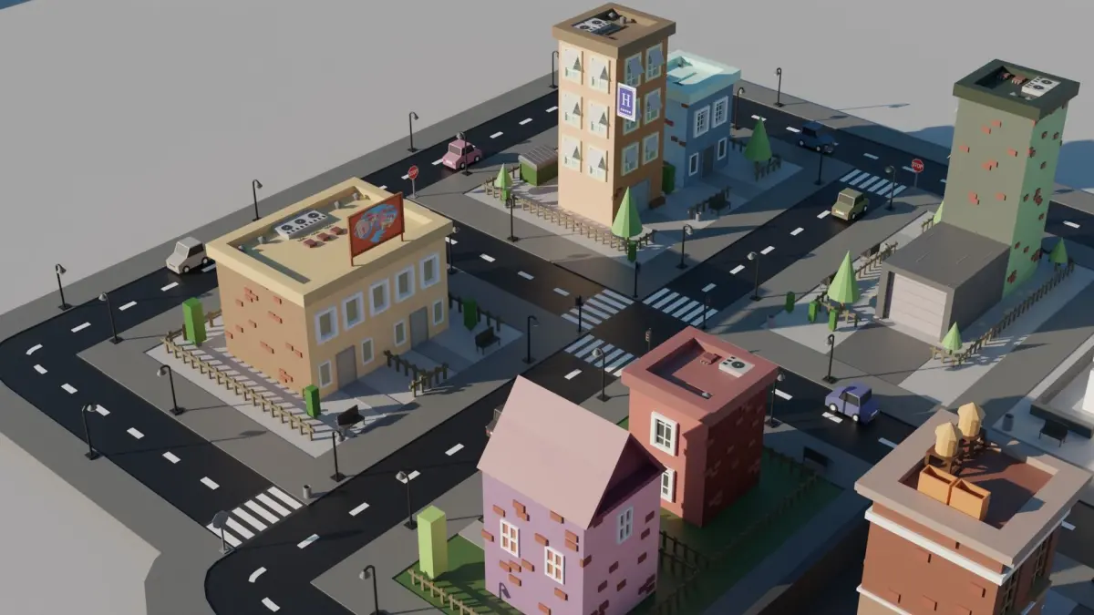 Modeling of a small town low poly with houses and some cars.