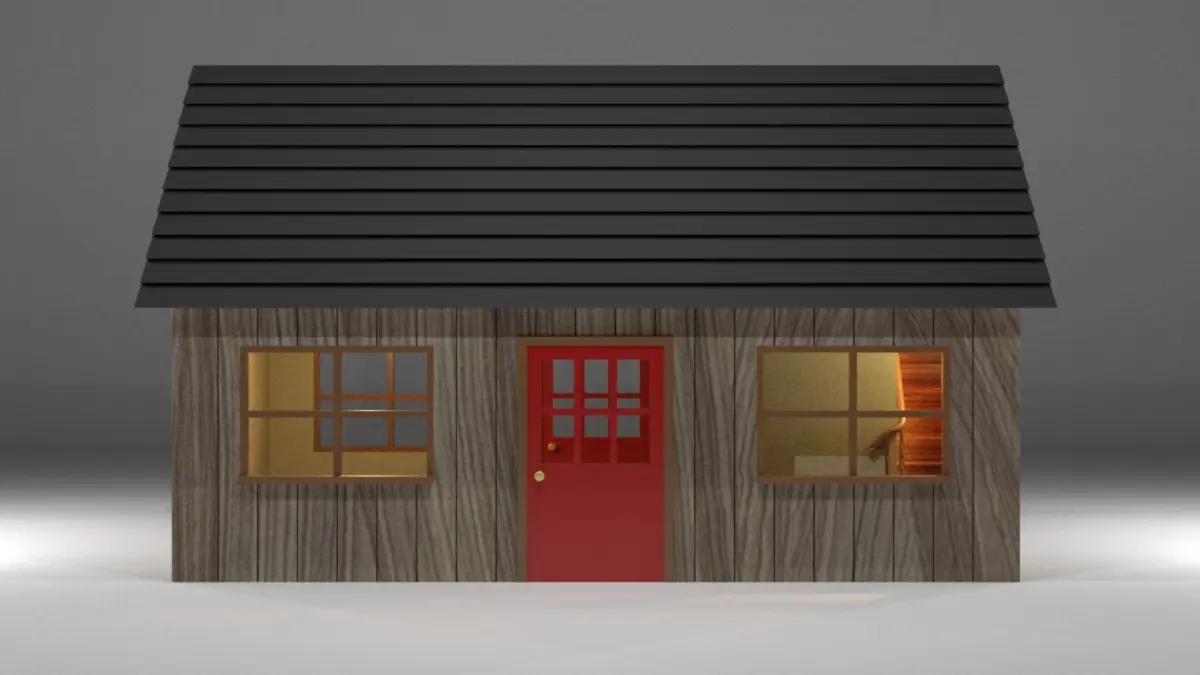A small wooden lodge/house with one small bedroom on the ground floor and one lager bedroom space in the loft.