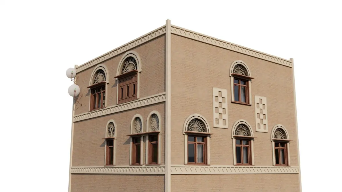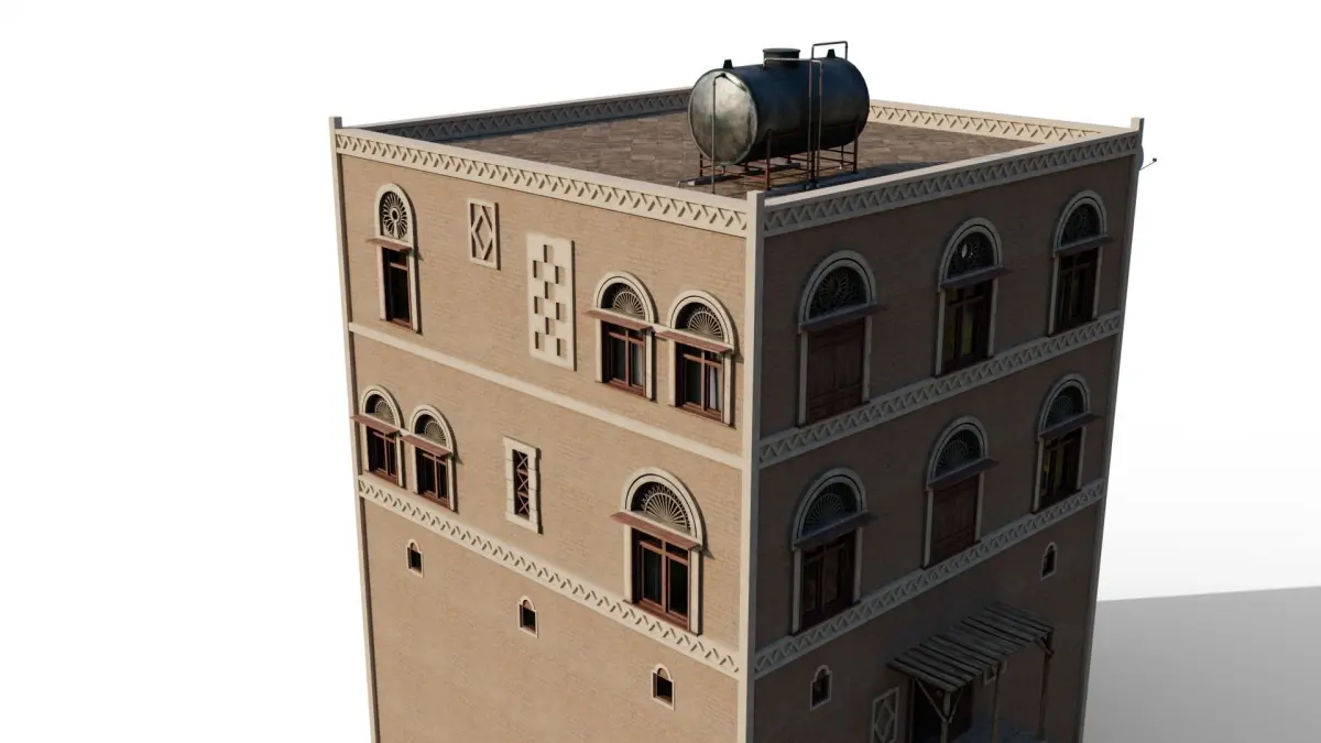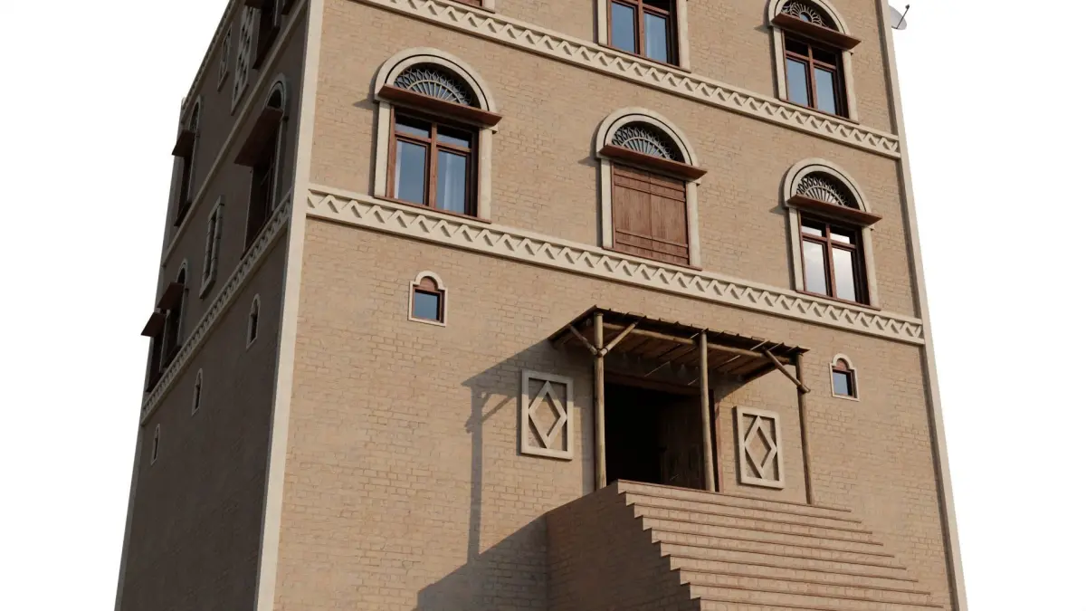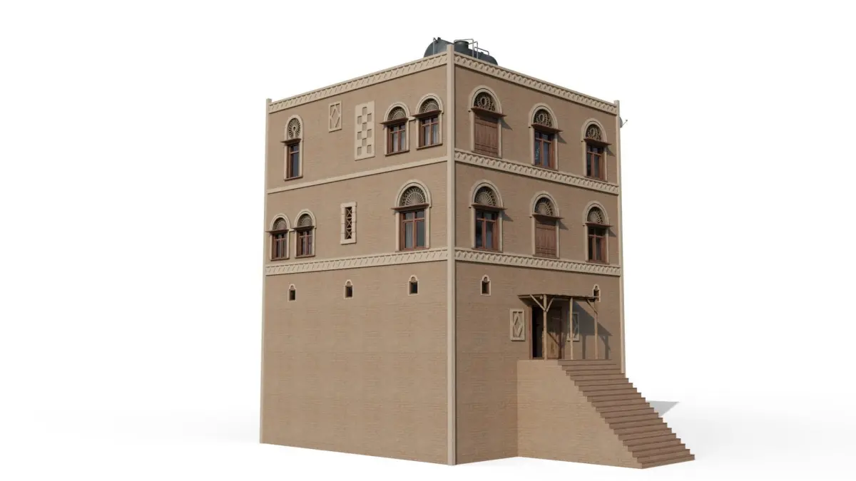 Inspired by traditional Yemeni architecture, featuring characteristic elements such as adobe walls, ornate wooden windows, and distinctive geometric patterns. This Yemeni apartment building consists of multiple floors and rooms. The building includes a detailed exterior and interior made up of modular pieces that allow for customisable layouts. The model is composed of 17 materials with a mix of overlapping and non-overlapping materials.