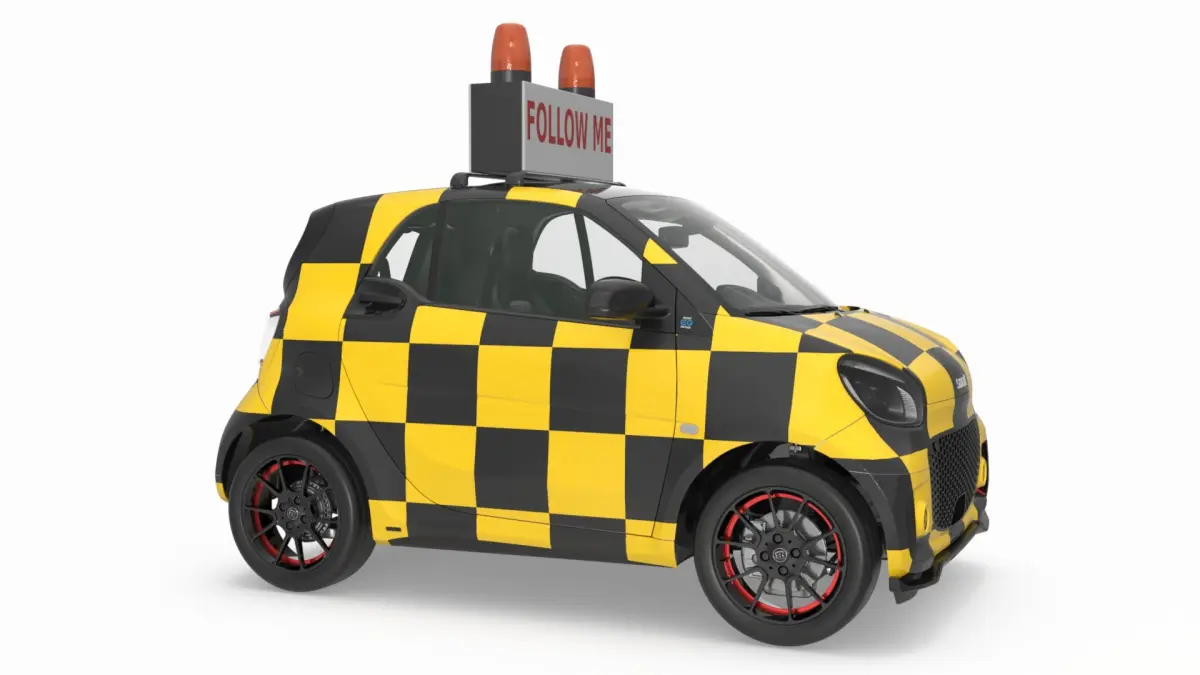 Smart Car Follow Me Airport Vehicle Simplified is a 3d model of a compact airport ground vehicle, designed to guide aircraft on taxiways and runways with simplified geometry and minimal detail for optimized use in various projects.