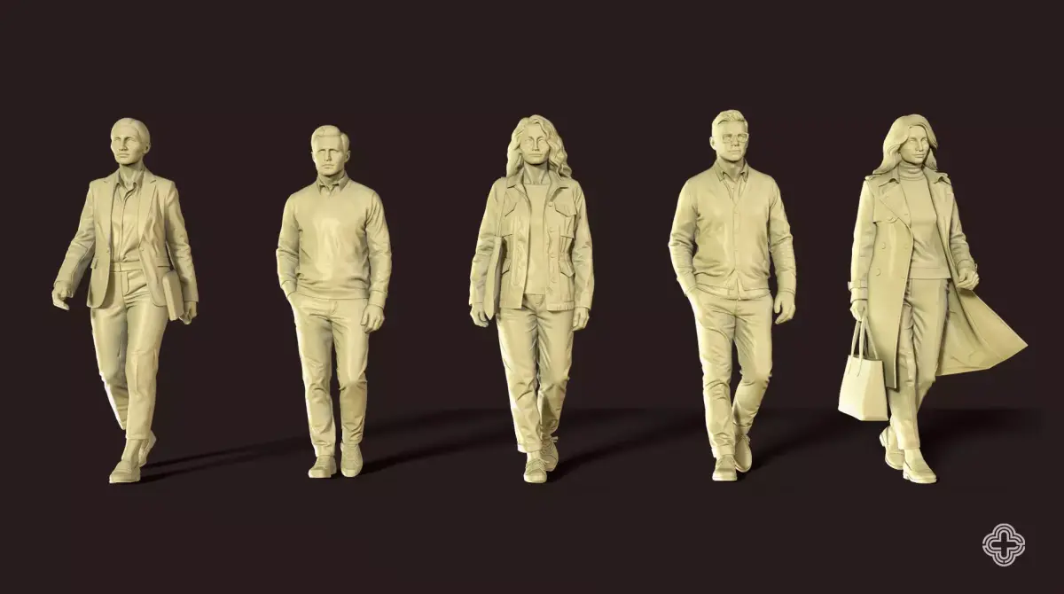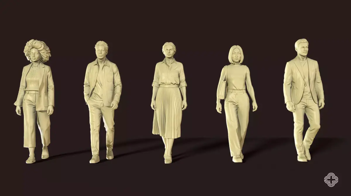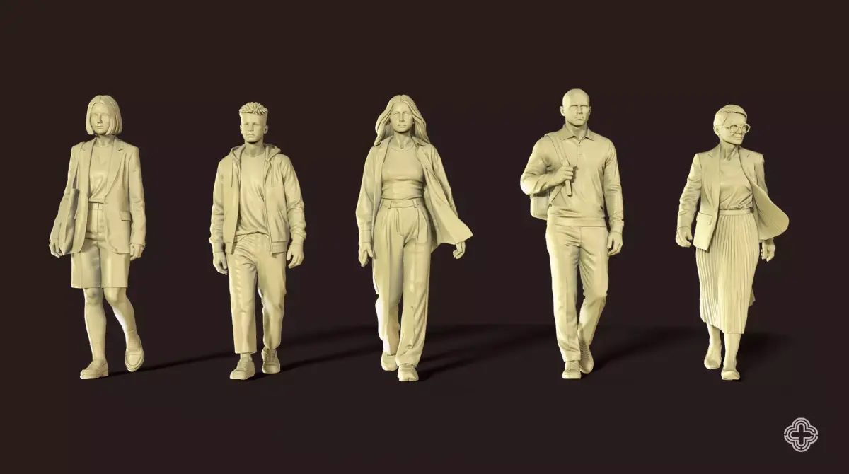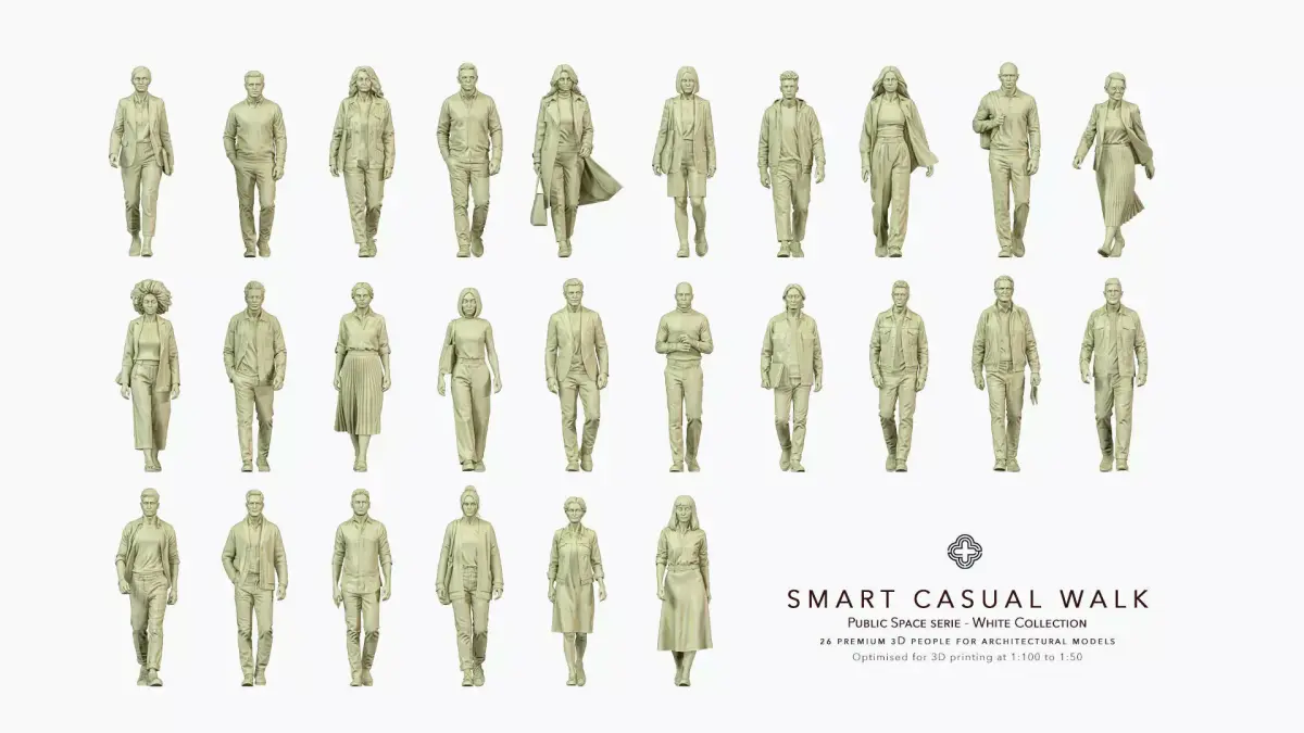 Inject diversity and realism into your architectural models with the Smart Casual Walk pack. This set features 26 high-quality 3D walking figures designed specifically for architectural maquettes and visualization (ArchViz). The Smart Casual dress code (blazers, light jackets, stylish everyday wear) bridges the gap between formal business and relaxed leisure, making it versatile for office districts, cultural centers, and mixed-use public spaces.