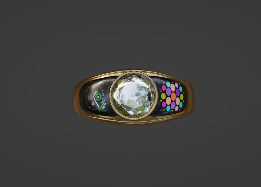 An elegant gold smart ring, featuring a dazzling gemstone, seamlessly blends luxury and technology. Designed to discreetly monitor health metrics, it tracks vital signs and activity levels while providing real-time feedback for improved well-being. This sophisticated accessory boasts a sleek, lightweight design that complements any outfit, making it a perfect companion for both formal events and everyday wear. Engineered for modern lifestyles, it offers convenience and innovation without compromising style. Whether you're tracking fitness goals or staying mindful of your health, this smart ring represents a perfect fusion of aesthetics and functionality, tailored for today's tech-savvy individuals.