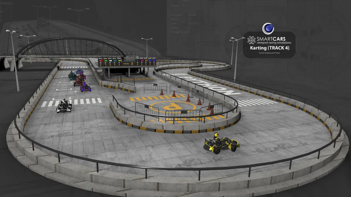 This is a viewport AI go kart simulation. It is assumed that you use this software very well and have a lot of knowledge. Even so, just press play and sit back and watch the animation. In the meantime, you decide what you can do. I think you immediately understood what you could change.