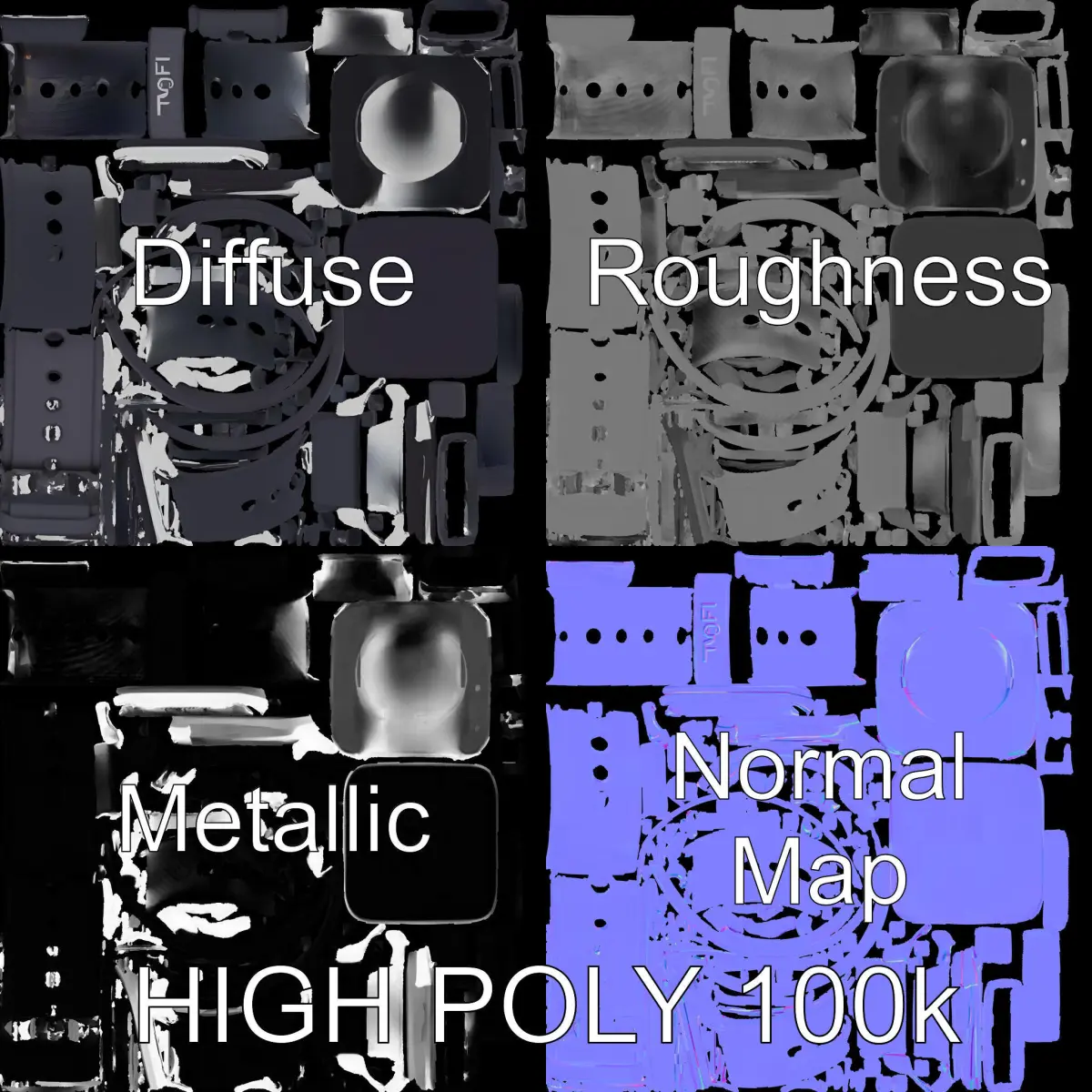 This 3D model pack features a detailed smartwatch design with three levels of detail for versatility. The model is perfect for product visualizations, virtual reality environments, and interactive presentations. With PBR textures including Diffuse, NormalMap, and reflection/roughness/metallic, the model showcases realistic materials and surfaces suitable for any modern rendering engine. The textures are 4096*4096, ensuring high-quality visual output. The model is accurately unwrapped with no overlapping UVs.