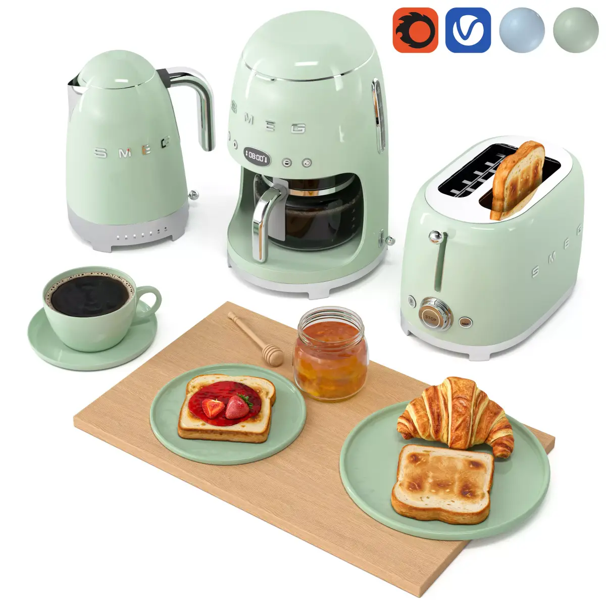Description:High-quality 3D model of a Smeg breakfast set in mint green and blue pastel, including a coffee maker, electric kettle, and toaster, accompanied by a breakfast scene featuring toast, croissant, jam, honey, and a cup of coffee.The model is perfect for interior visualizations, kitchen scenes, and product renderings.All models are clean, quad-based topology, UV unwrapped, and optimized for V-Ray and corona + 3ds Max.Materials and textures are included.Ready to render.