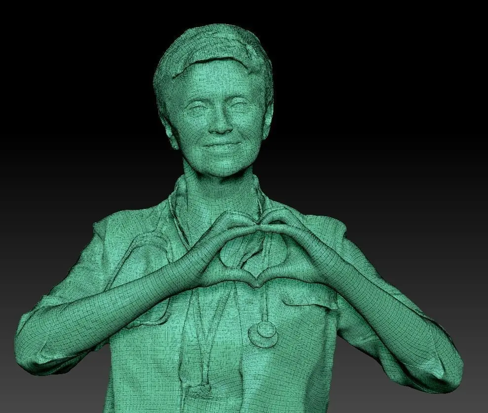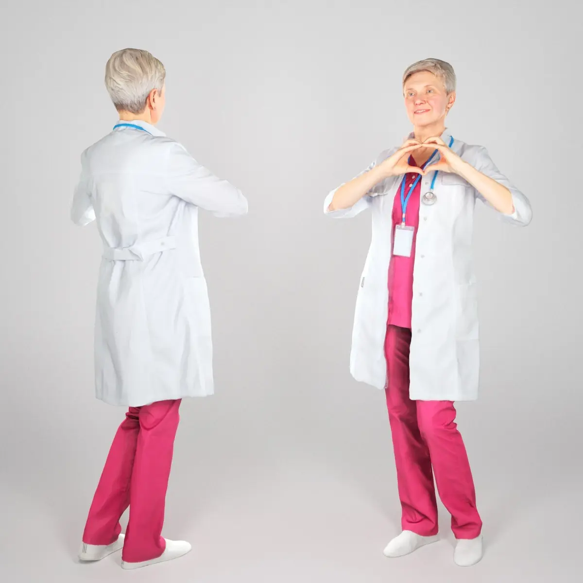 This is a true human size and detailed model of a beautiful adult woman of Caucasian appearance dressed in a uniform of a surgical doctor. The model is captured in casual pose to be perfectly matching to variety of architectural visualization, background character, product visualization, e.g. advert banners, professional products/devices presentations, etc.