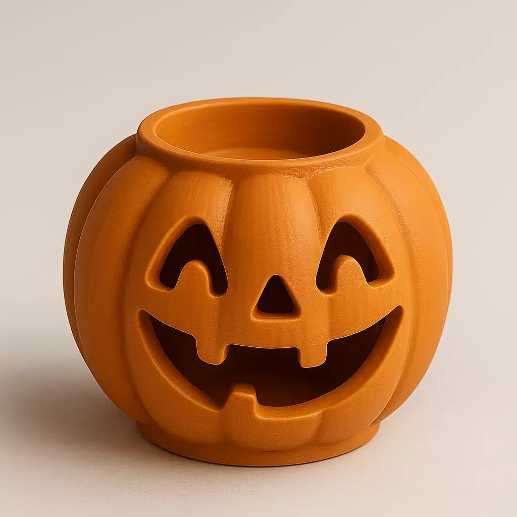 A delightful 3D-printed pumpkin candle holder featuring a cheerful, carved face with a wide smile and closed, joyful eyes. The round design easily fits a tea light or small LED candle, making it a perfect Halloween or autumn decoration for cozy, festive spaces.