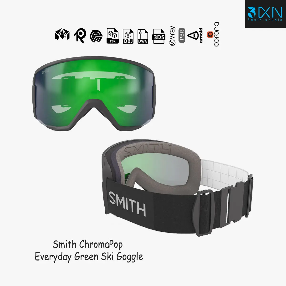 Smith ChromaPop Everyday Green Ski Goggle is a high quality, photo realistic 3d model that will enhance detail and realism to any of your rendering projects. The model has a fully textured, detailed design that allows for close-up renders, and was modeled in 3ds Max 2018 also has 3ds Max 2015 version and rendered with V-Ray. Renders have no post-processing.