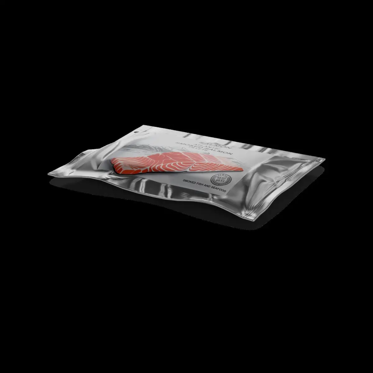 Smoked Salmon: A delicately smoked fillet of Atlantic salmon, carefully hand-sliced and packaged in a transparent vacuum-sealed pouch. The vibrant pink color of the salmon contrasts beautifully with the sleek silver packaging, which features an elegant label displaying the product name and a graphic of a jumping salmon.