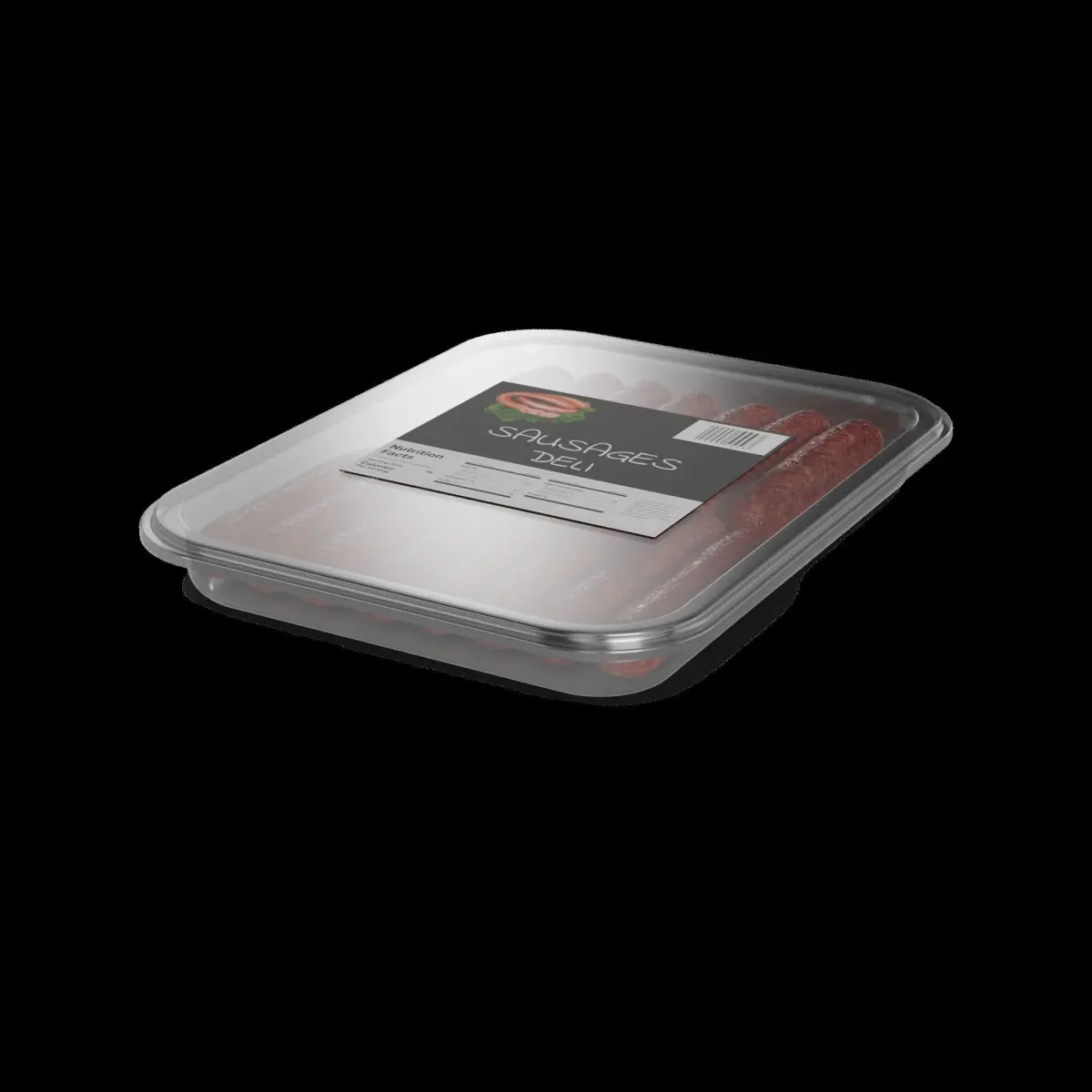 Smoked Sausages: Indulge in the rich and savory flavors of our Smoked Sausages. Made with the finest quality meats, these sausages are carefully seasoned and smoked to perfection. Packaged in a transparent plastic container, the sausages are showcased in all their delicious glory. The packaging includes an informative label with a graphic illustration of a smoking chimney, providing you with important details about the product. Each container contains 15 sausages, ensuring you have plenty to enjoy.