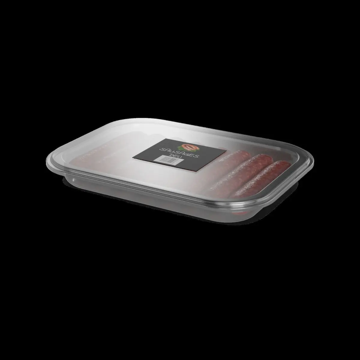 Smoked Sausages: Indulge in the smoky goodness of our Smoked Sausages. These sausages are made using a traditional recipe, combining the finest meats with a blend of aromatic spices. Packaged in a sleek silver tray, the sausages are neatly arranged and sealed for freshness. The packaging includes a stylish label with a minimalist design, featuring the product name in bold letters. Each tray contains 10 sausages, providing you with a satisfying portion for a delicious meal.