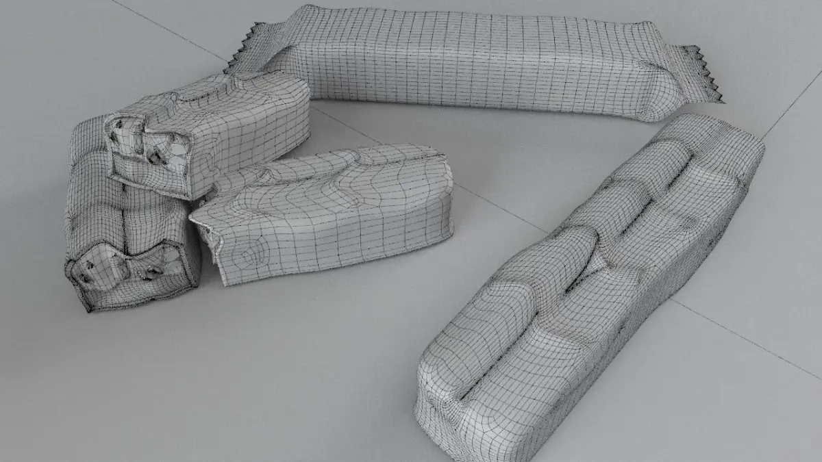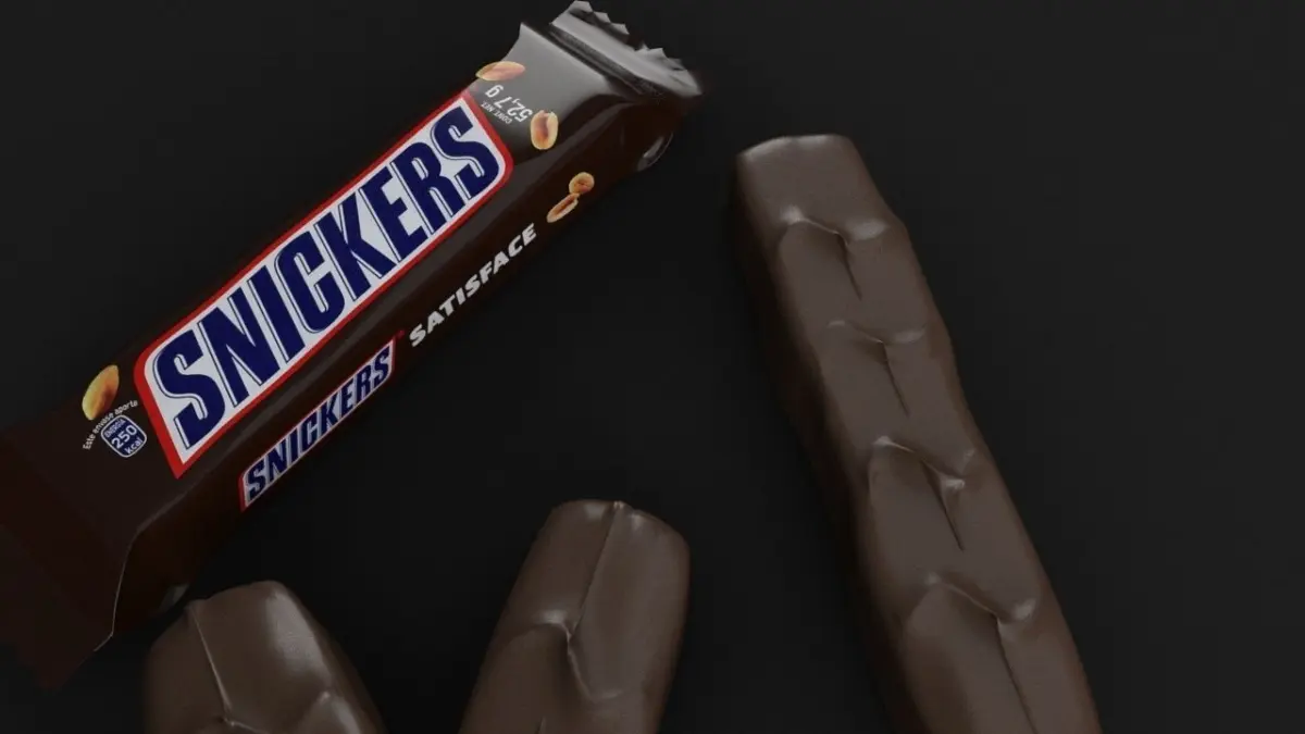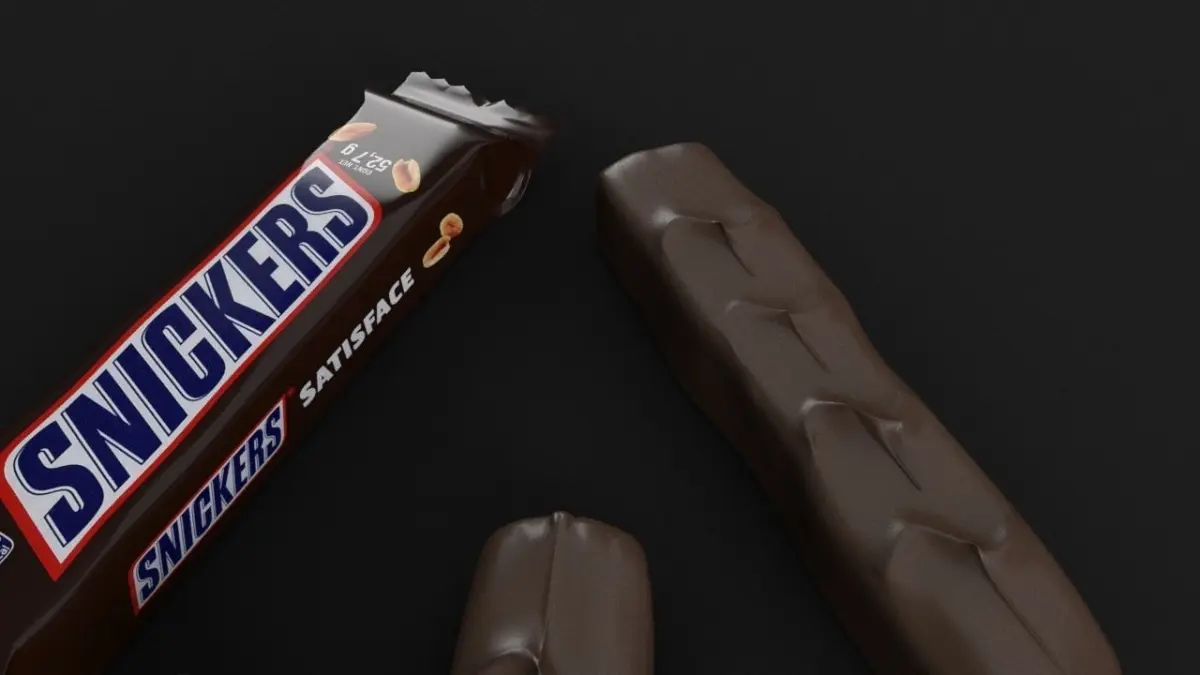 3d model of a chocolate bar with snickers nuts. The project has materials of chocolate, nougat, nuts and caramel. Everything is done by geometry. Corona rander 1.7 project. As lighting 1 hdr and 3 light sources