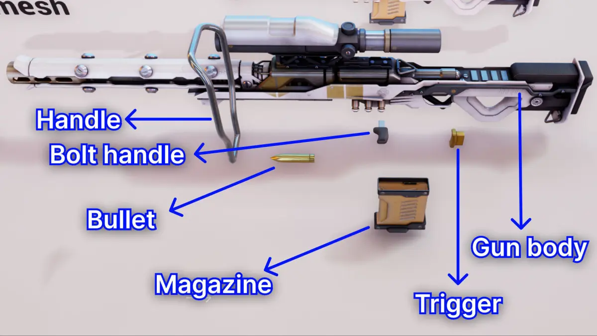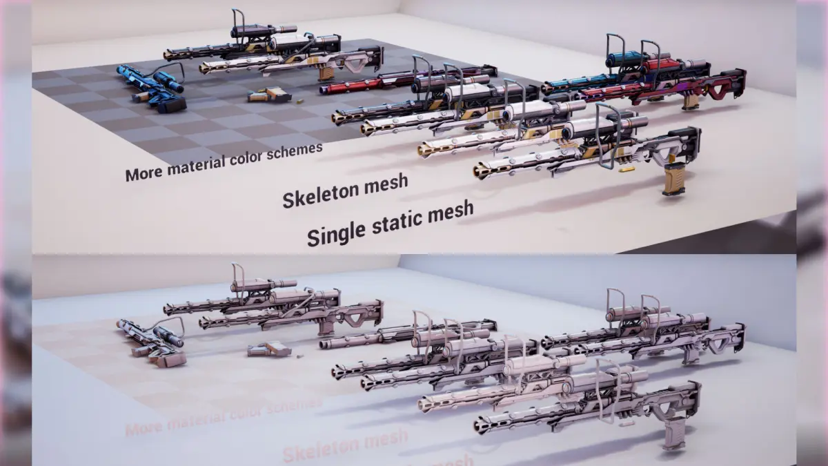 Contain:1 Blender project file12 gun and its component models (1 skeletal mesh and 11 static mesh)4 sets of materials and their textures (4 color schemes)1 weapon firing animation