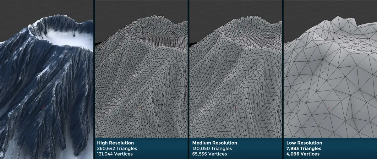 - Terrain Mesh in Blender, 3DS, OBJ and FBX formats, in following polycounts: