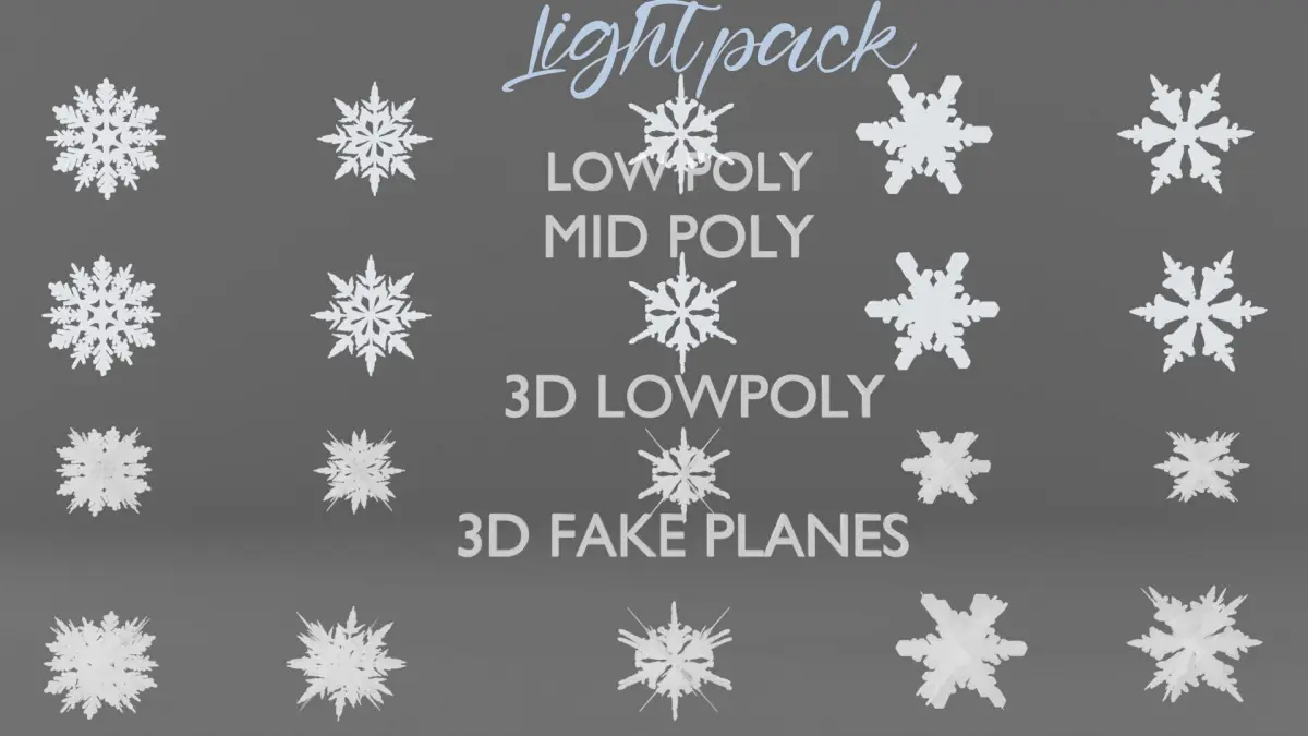 In this bundle are 20 snow crystals models included (low poly & mid poly & 3D low poly & 3D fake planes), two material shaders are also part of this pack (one of them is my popular Procedural & Texture Snow Shader which has been adapted to the small snowflakes) and a Geo Node Modifier has also been added to allow quick work with a particle system.