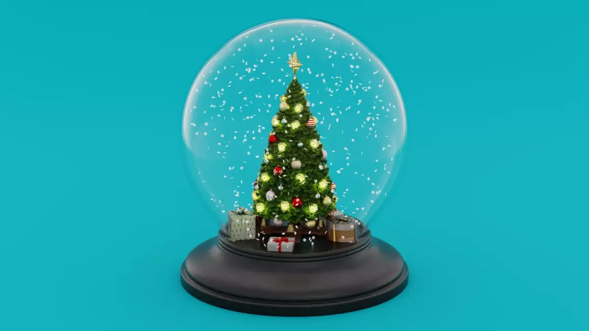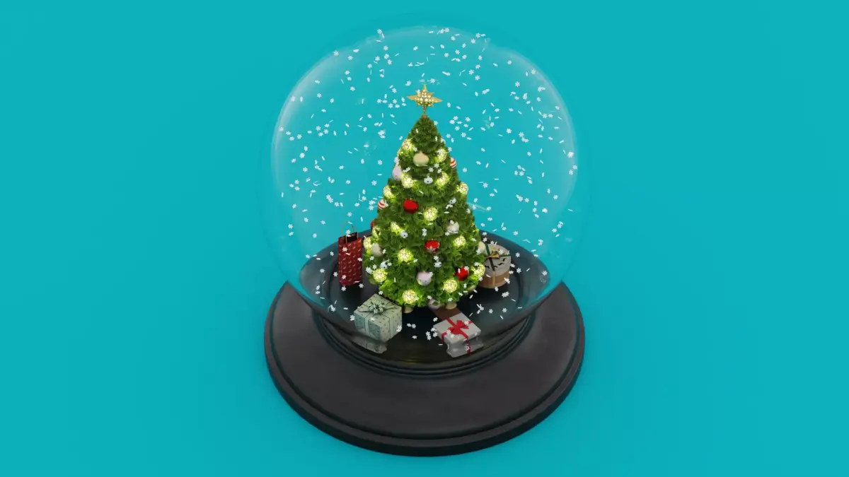 A fully prepared 3D model of a snow globe containing a holiday scene with a decorated tree, wrapped gifts, and scattered snowflakes. The globe and interior objects are cleanly modeled and optimized, with high-quality PBR textures capturing the reflective glass, detailed foliage, and festive decorations.