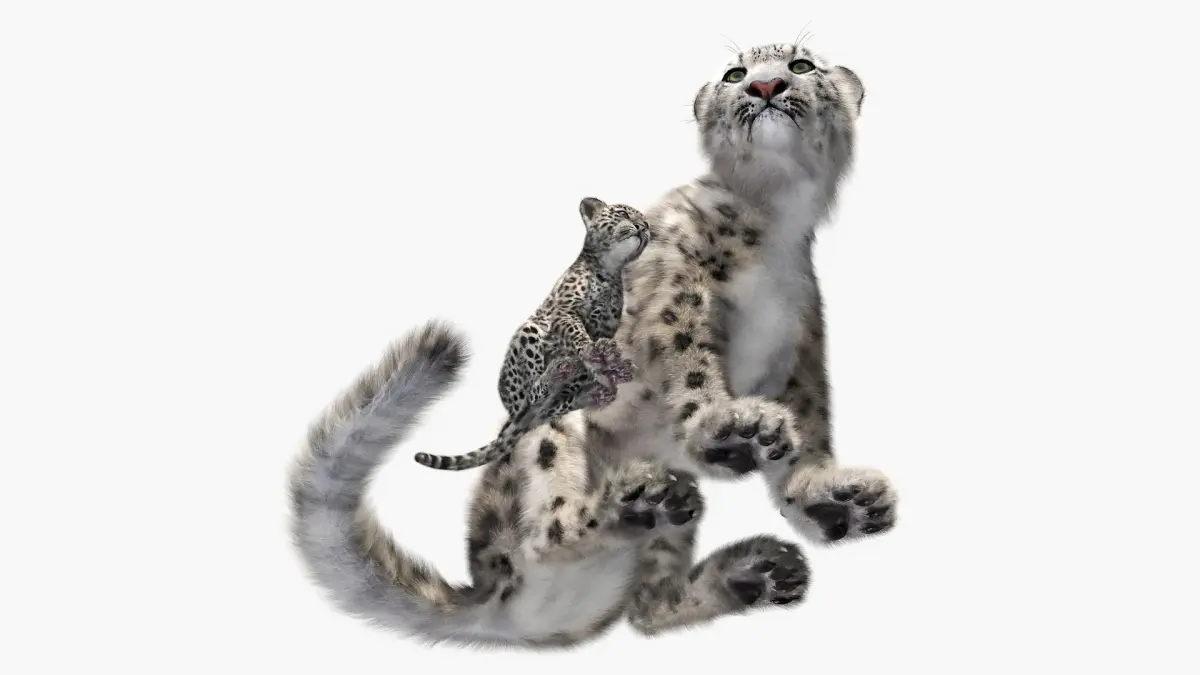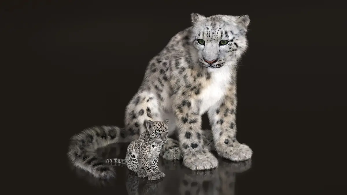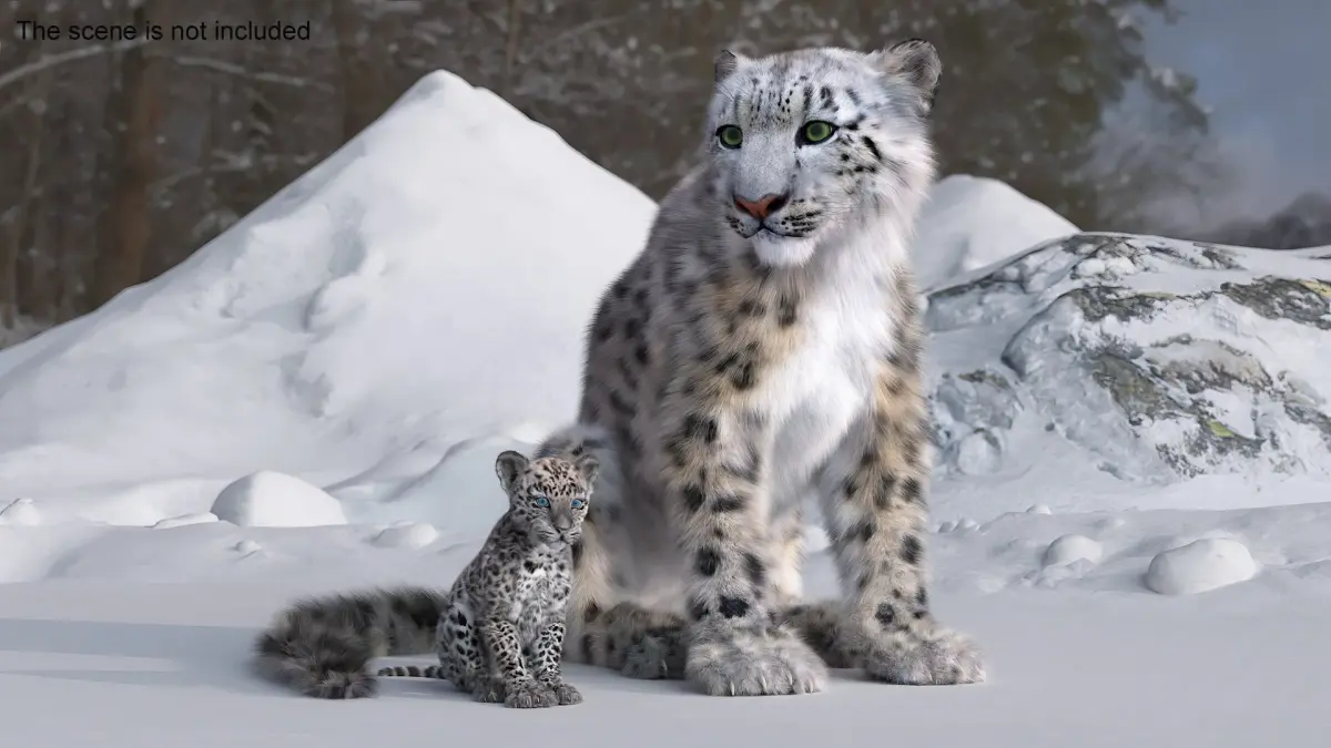Snow Leopard Mother and Calf Fur is a 3d model of an adult snow leopard alongside its cub, capturing the majestic beauty and grace of these elusive big cats.