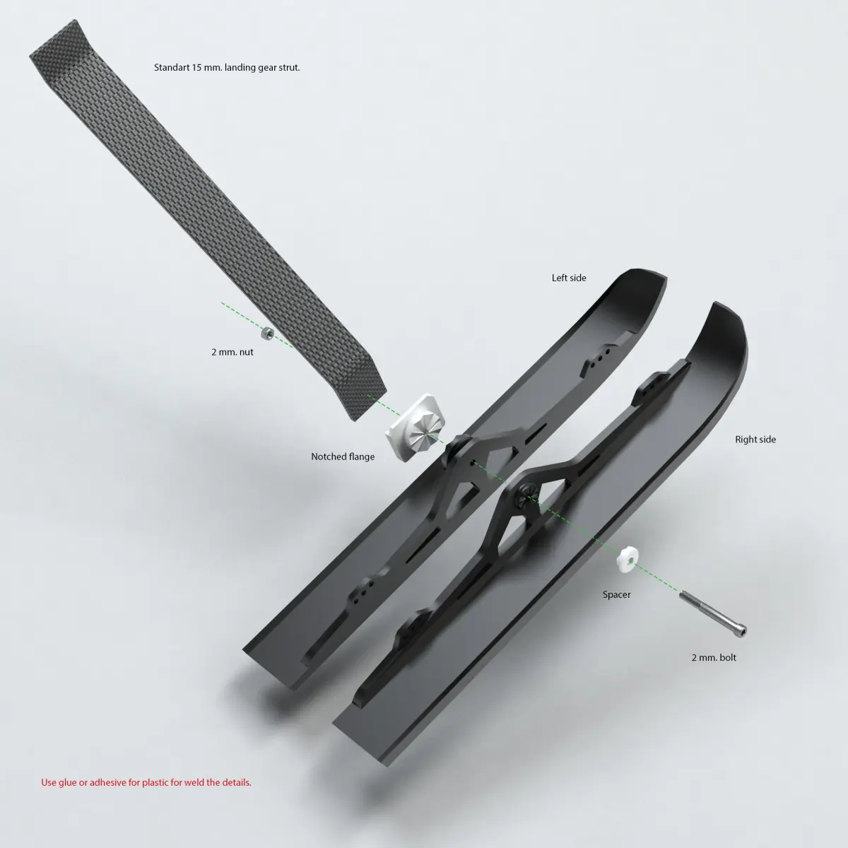 No spring system: notched flanges for strong & safe mounting the skis, remain in a fixed position while in flight. No poor aerodynamics, no bad landingsMade in equal scale. Measurement: millimeters .mm length: 168 mm., width: 44 mm., axle size: 2 mm.