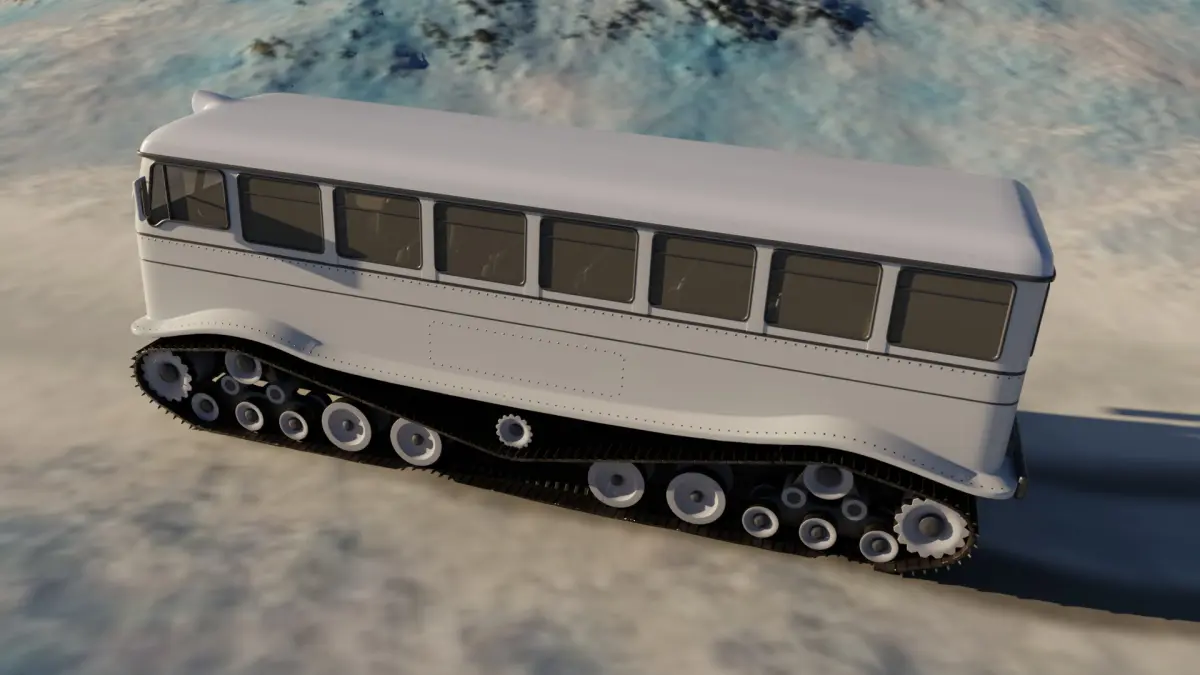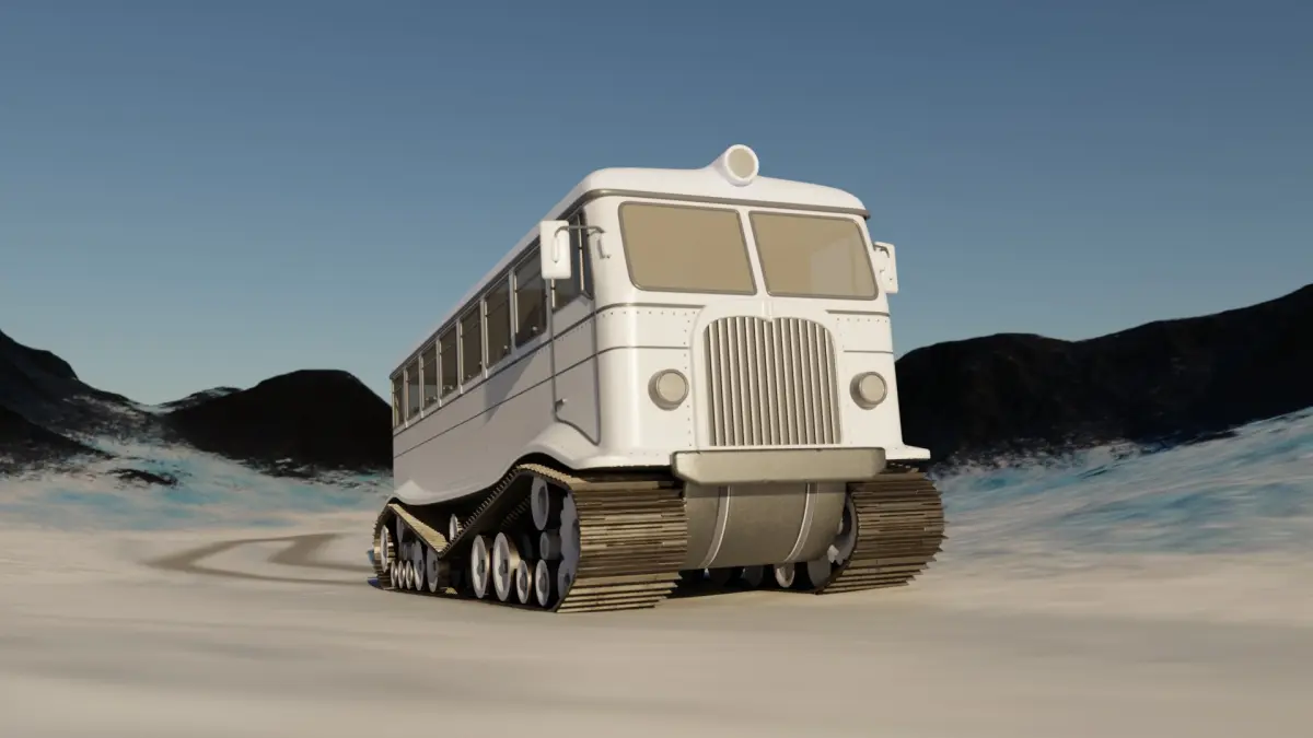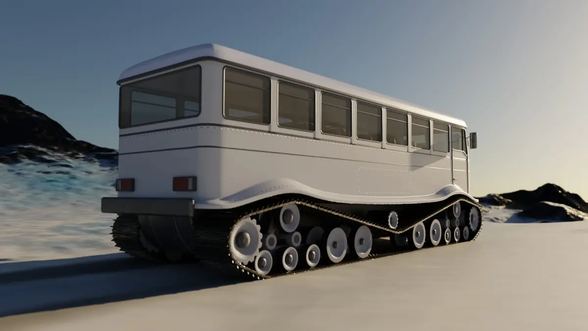 3D model of a snowcat bus designed for civilian use during the icy winter months, featuring a sleek and angular body with a white color scheme, equipped with motorized tracks for traversing through thick snow effortlessly.The model comes with 1-4k resolution texture packs.