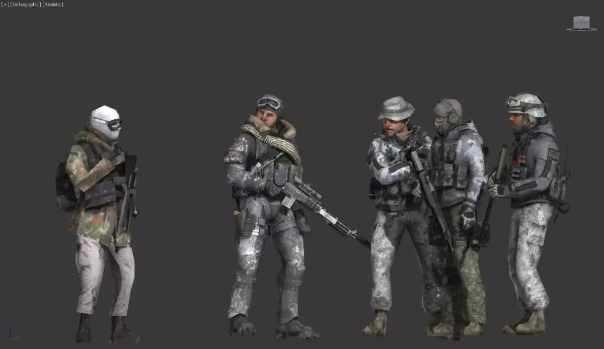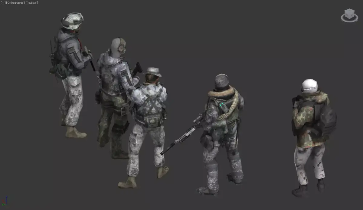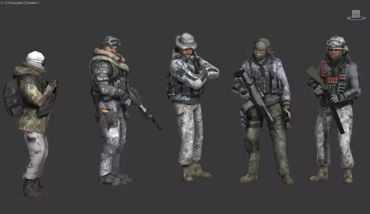 A small squad of infantry support characters with a weathered snow-mobile/jet-sled in the center.Appearance: five soldiers in winter camo with varied gear (backpacks, plates, and scarves). Each soldier has a distinct posture, ready for action, with a rugged, survivalist vibe.Vehicle & gear: a compact, rugged snow-sled or scout bike in muted olive/green tones, with a brown leather seat and storage pouches. Accessories include a red star emblem on one bag, implying a thematic faction.Materials & textures: worn fabrics, snow-dusted armor, and metal hardware; overall palette is gray, white, and earth tones to convey arctic/foothill conditions.Character vibe: a troops unit prepared for cold-weather operations, capable of mobility with a light armored transport.