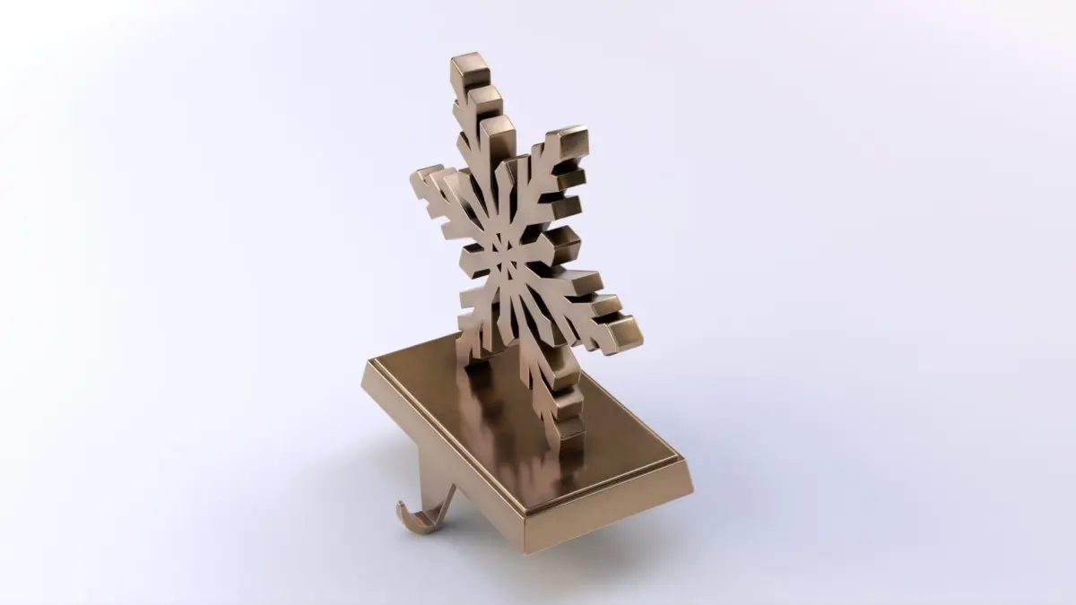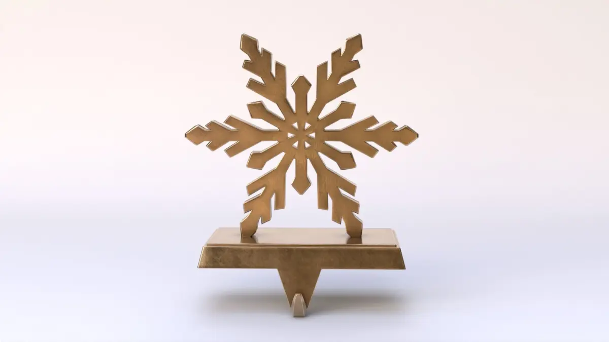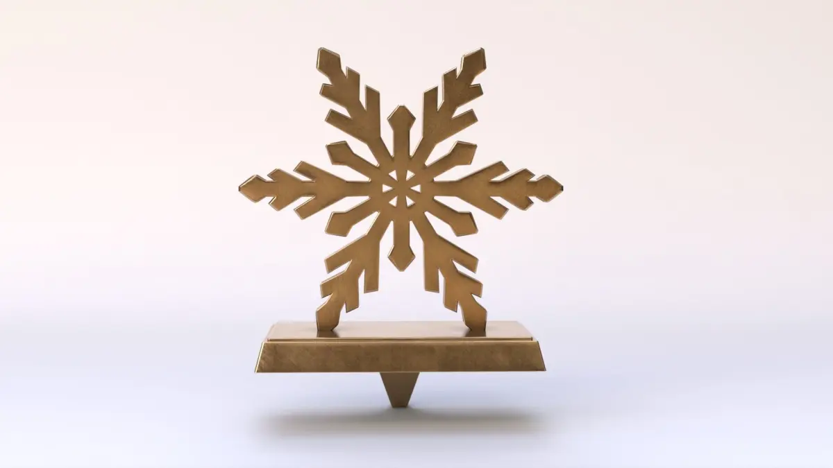 Snowflake shaped brass hanger for the Christmas stockings in your holiday scenes. High quality, photo real model with 4K PBR textures that allow for close-up renders. Modeled in Maya 2023 and rendered in Arnold. The mesh is centered at the origin (0,0,0) with the pivot point at the bottom of the flat part of the hanger’s stand so you can easily snap the hanger to a shelf or a fireplace mantel.