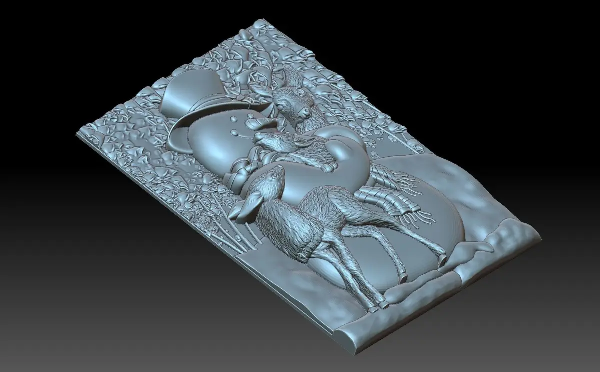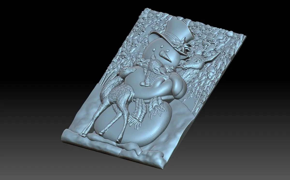 A 3D model of a bas-relief on a New Year's theme with the image of a snowman and deer. There are trees in the snow in the background. A nice and beautiful job with a New Year's atmosphere.